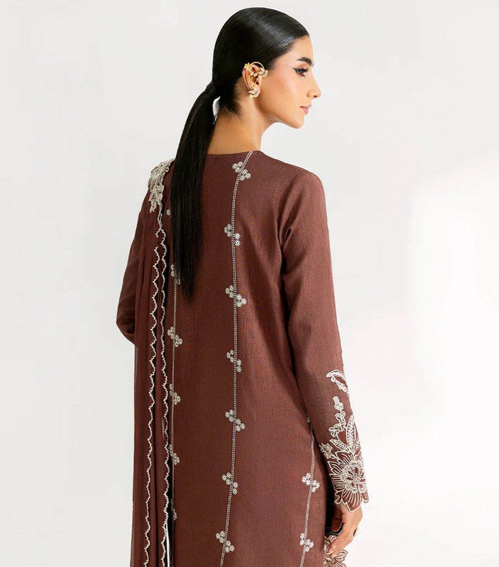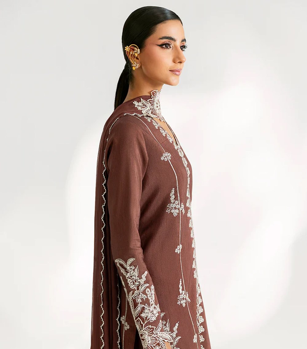 Crafted from luxurious Korean raw silk, the dress features intricate resham embroidery that highlights its timeless elegance. The look is paired with a graceful silk dupatta, adorned with resham embroidery, adding refinement and charm. A unique detail, the 3D motif on the sleeve, lends a modern artistic touch, making the outfit both classic and contemporary.