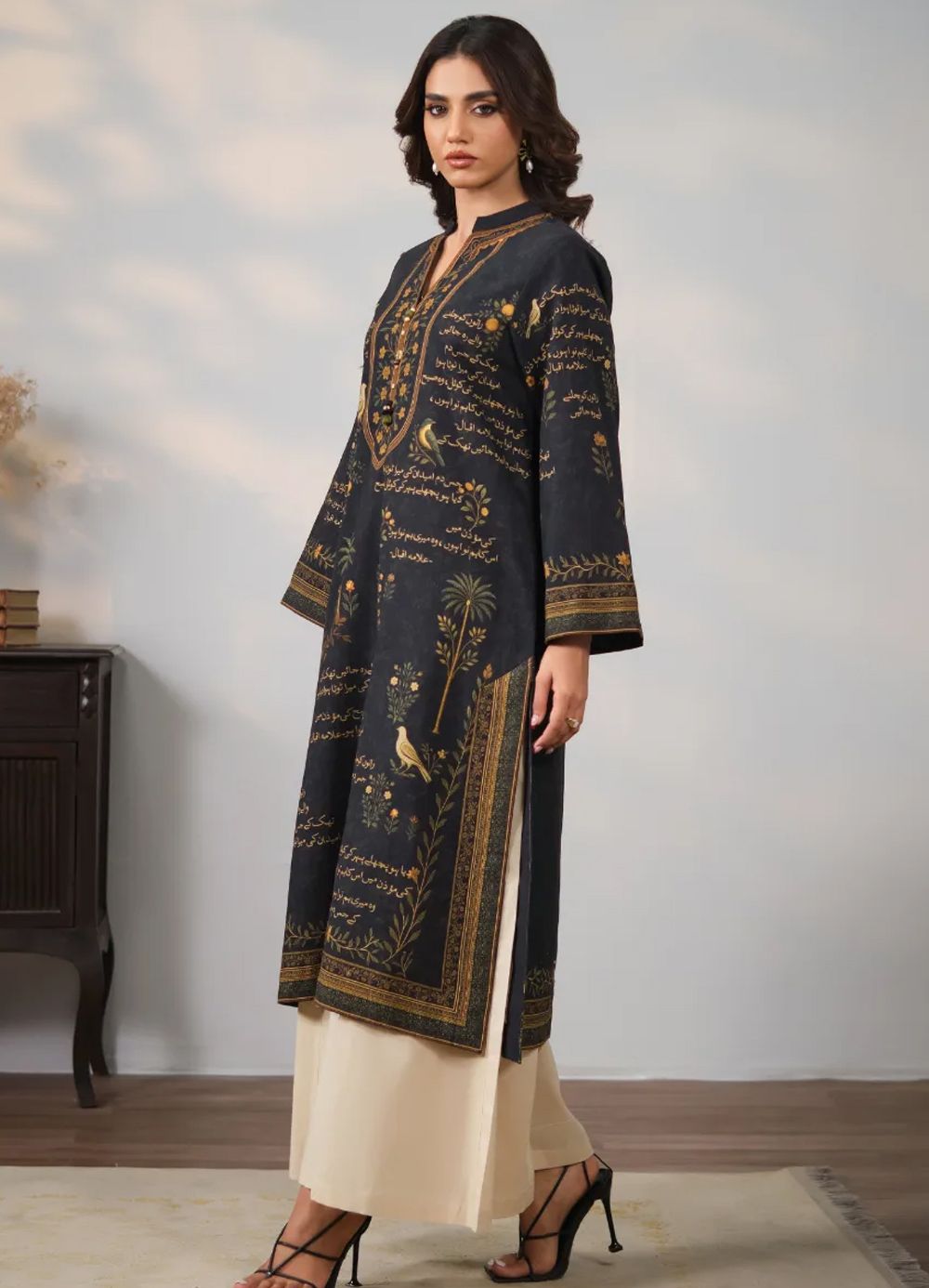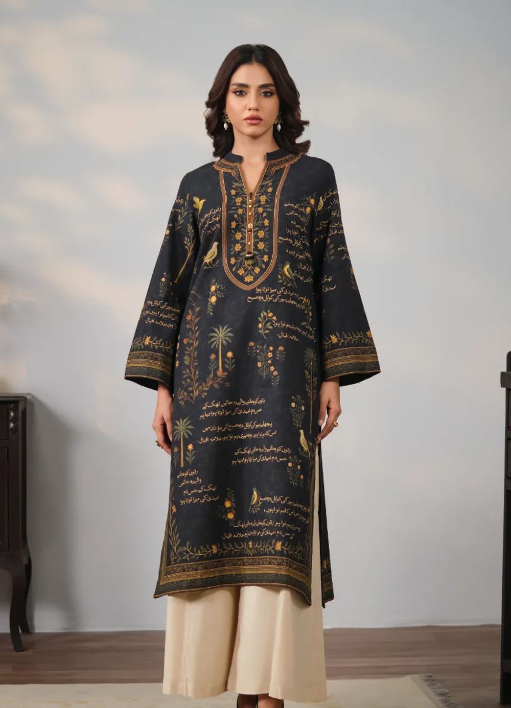 A straight, long khaddar shirt featuring an embellished collar neckline and the words of Allama Iqbal calligraphed across.