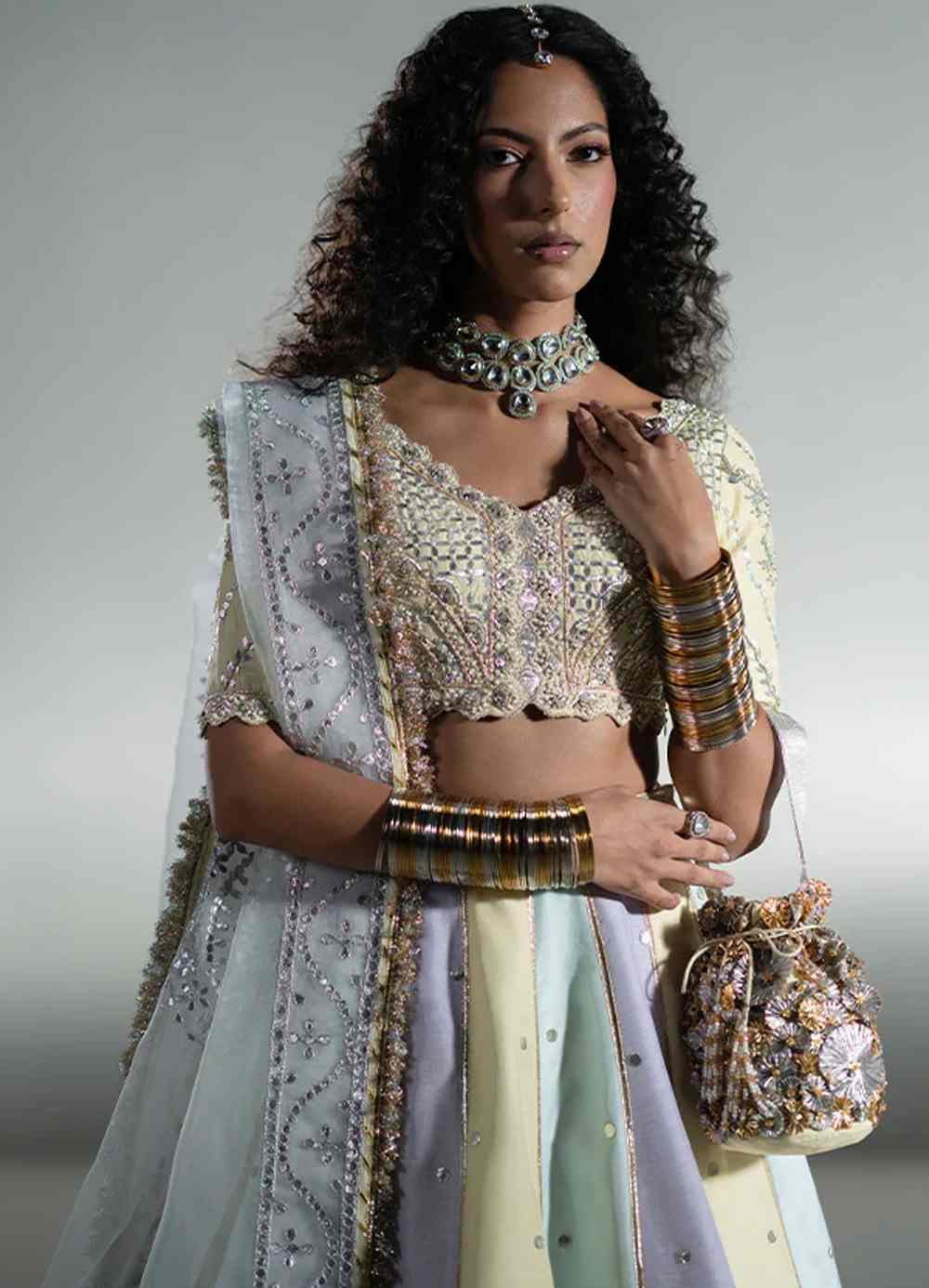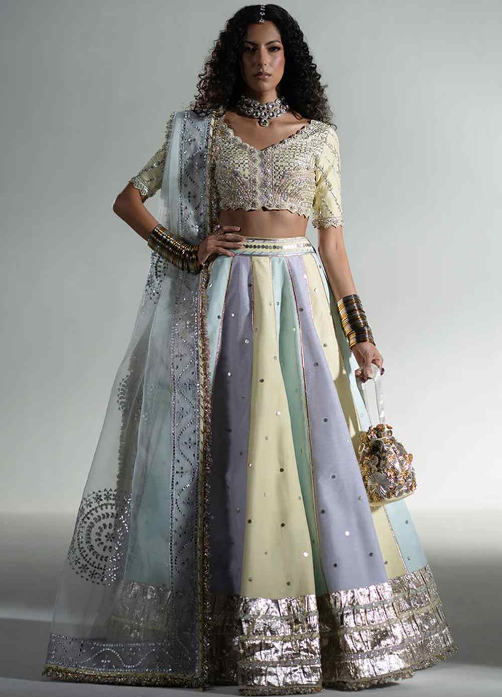 An ethereal aqua, lavender, and pale yellow lehnga choli set, intricately handworked with gota patti, zardozi, Swarovski crystals, sequins, and cut daana. The lehnga is finished with gota ribbons and a classic gota border, while the dupatta adds traditional charm with kiran edging and chatta patti lace.