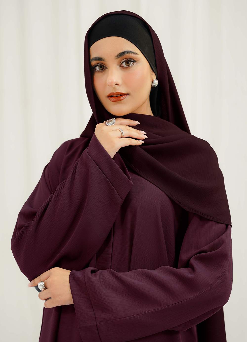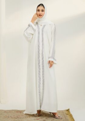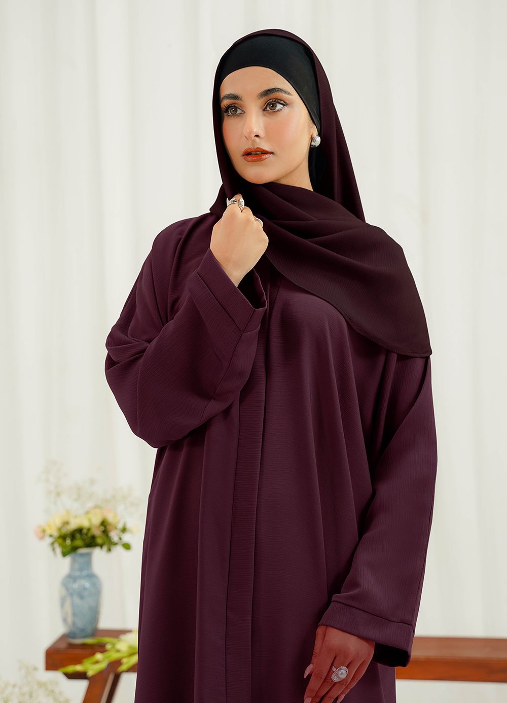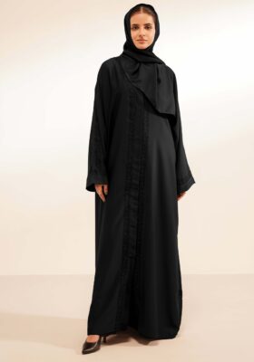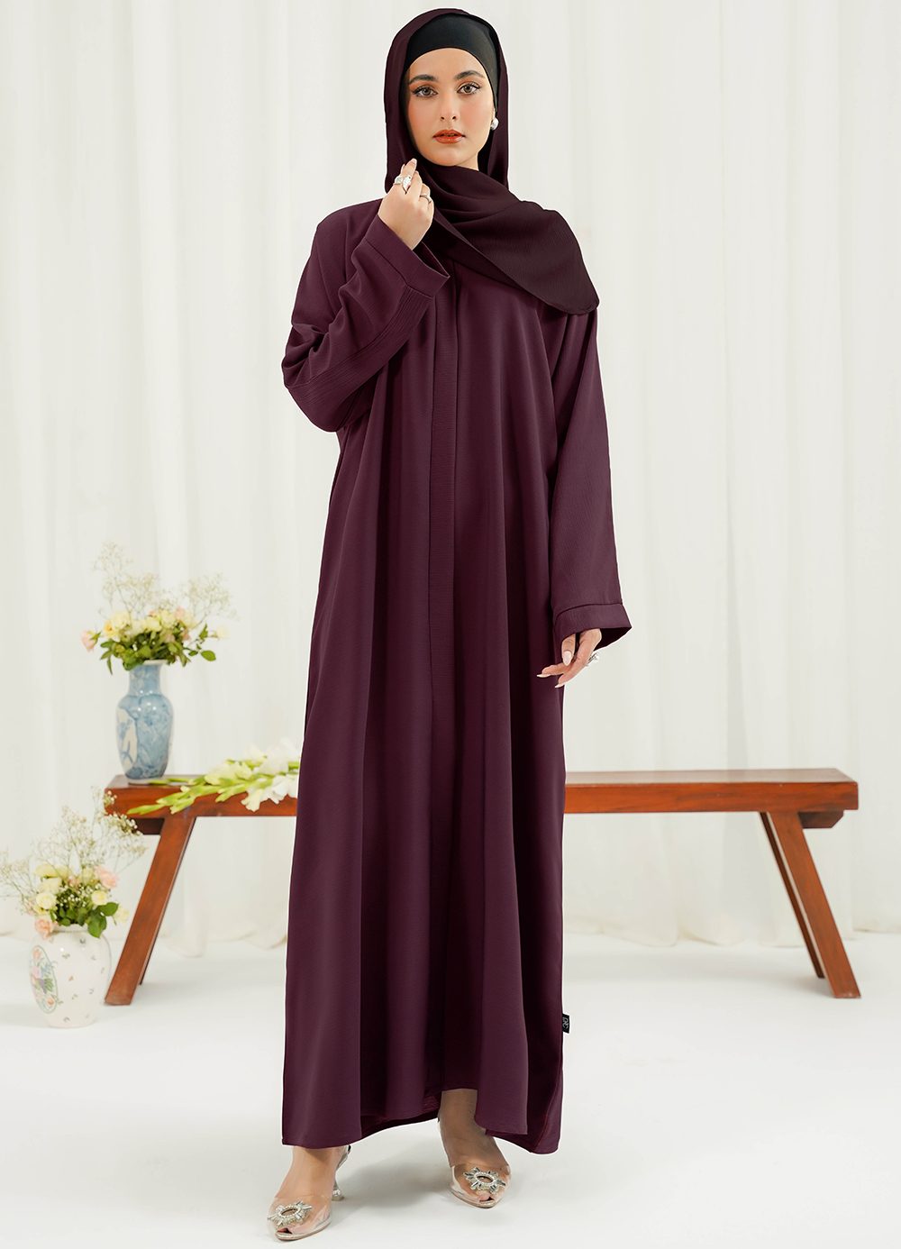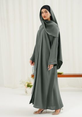 Design: This abaya features a relaxed, flowy silhouette with soft front pleats and a hidden button closure for a sleek.