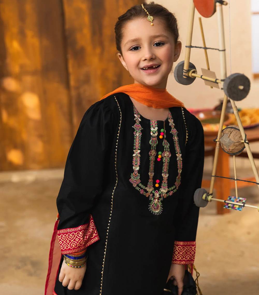 Upgrade your wardrobe with our black suit. Made with high-quality Cotton Lawn fabric and adorned with Tilla and thread embroidery, the shirt and Farshi Shalwar offer both style and comfort.