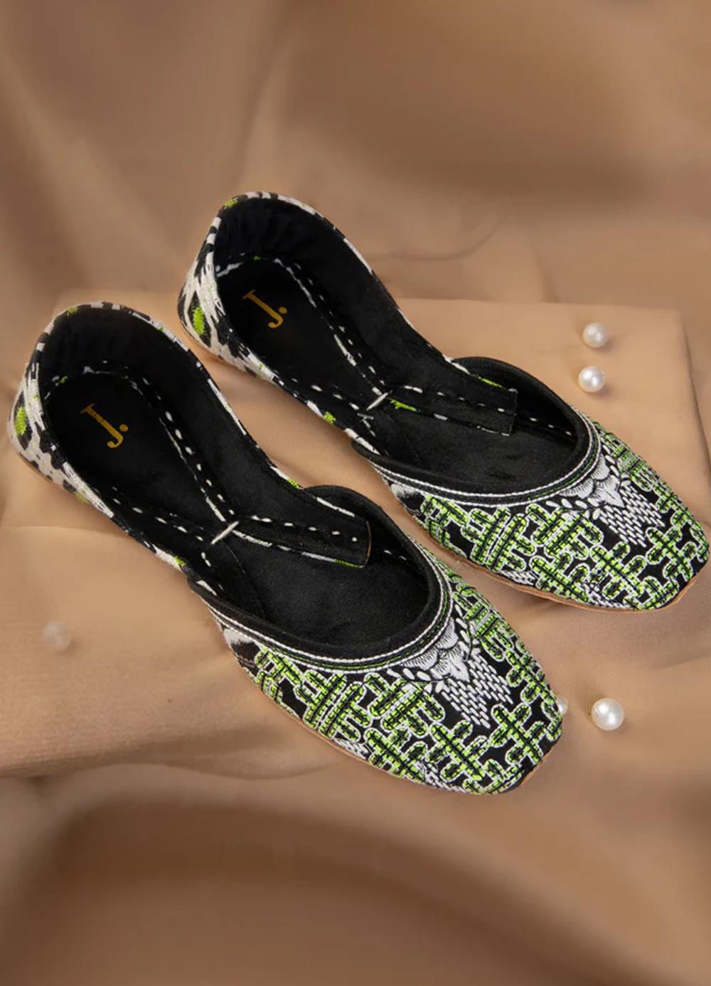 Black Khaddi Khussa : Elevate your traditional ensemble with these striking handcrafted khussa. Featuring a deep black base, this pair is brought to life with vibrant emerald green and white geometric embroidery.
