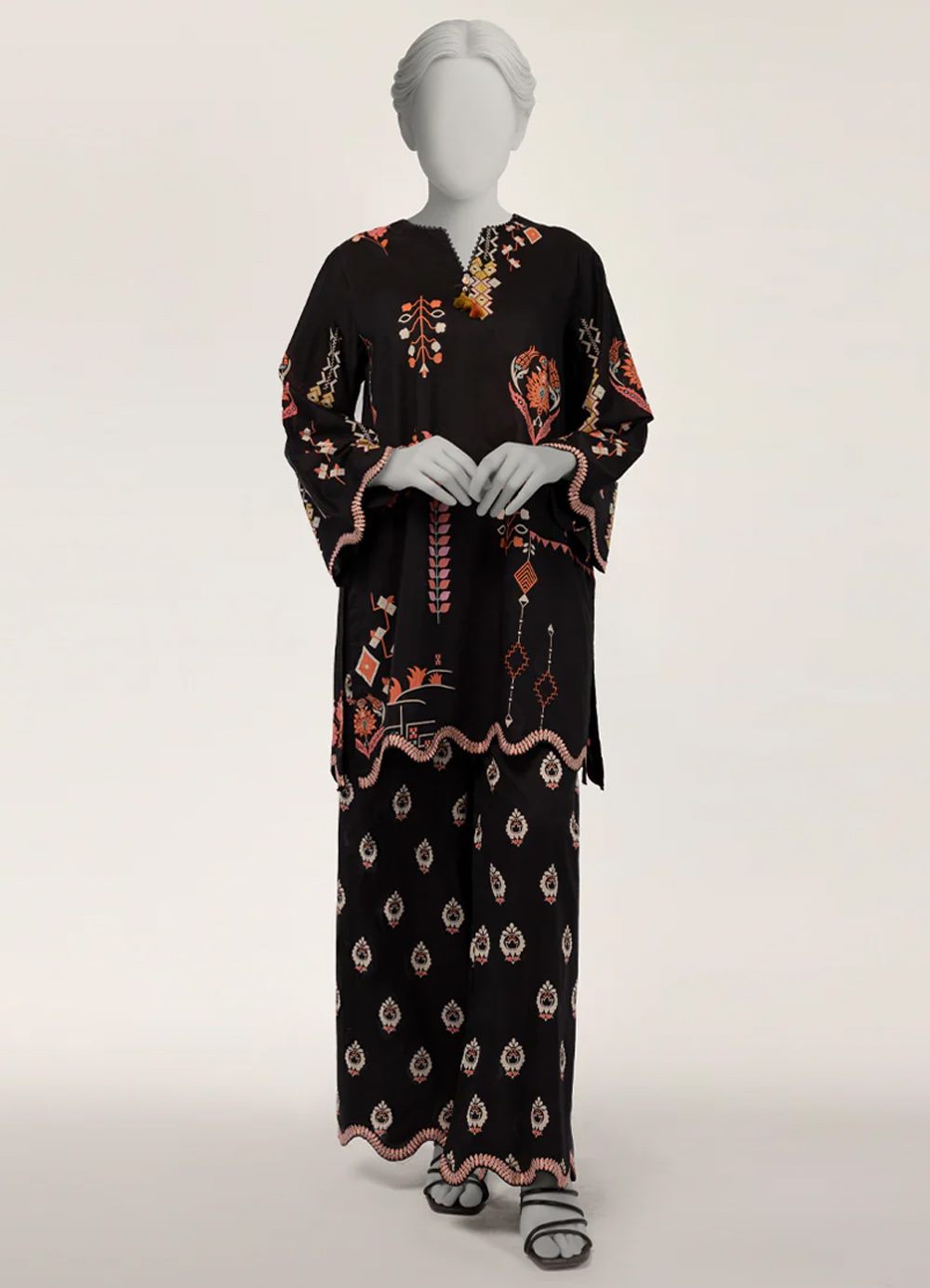 A two-piece stitched lawn outfit perfect for casual wear. The short straight shirt features a printed front with delicate embroidery, full sleeves, and a round neckline with slit. Paired with a matching embroidered lawn palazzo, this ensemble offers style and everyday comfort.