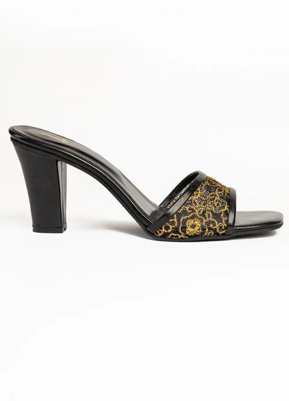 Black Net Chappal : Elevate your evening attire with these sophisticated block-heel sandals. Designed with a sleek black finish, these heels feature a prominent wide strap adorned with intricate gold floral lace embroidery
