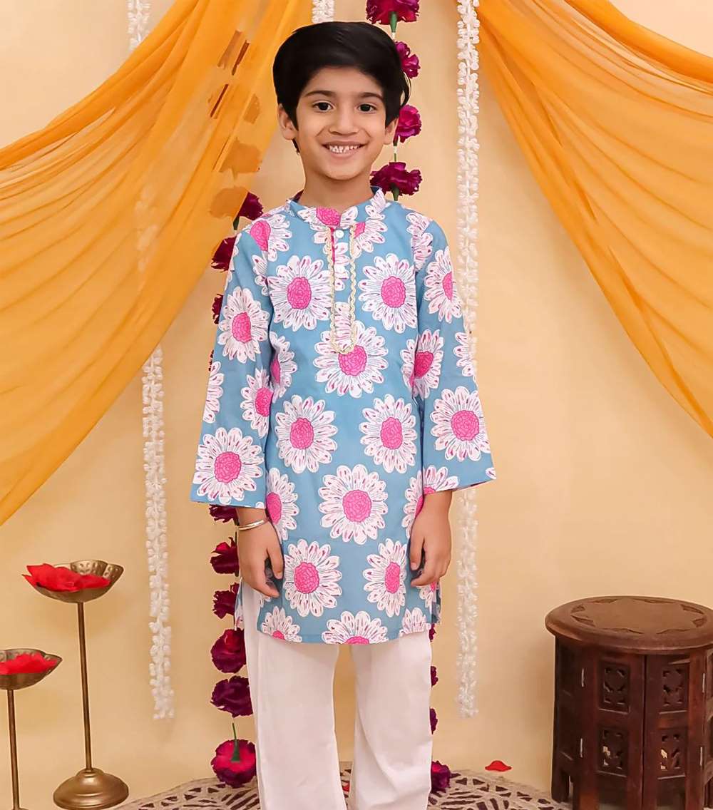 Dress up your little guy in style with our Blue Daisy Kurta Pajama! Made from soft and breathable cotton, this printed kurta pajama is perfect for the festive season.