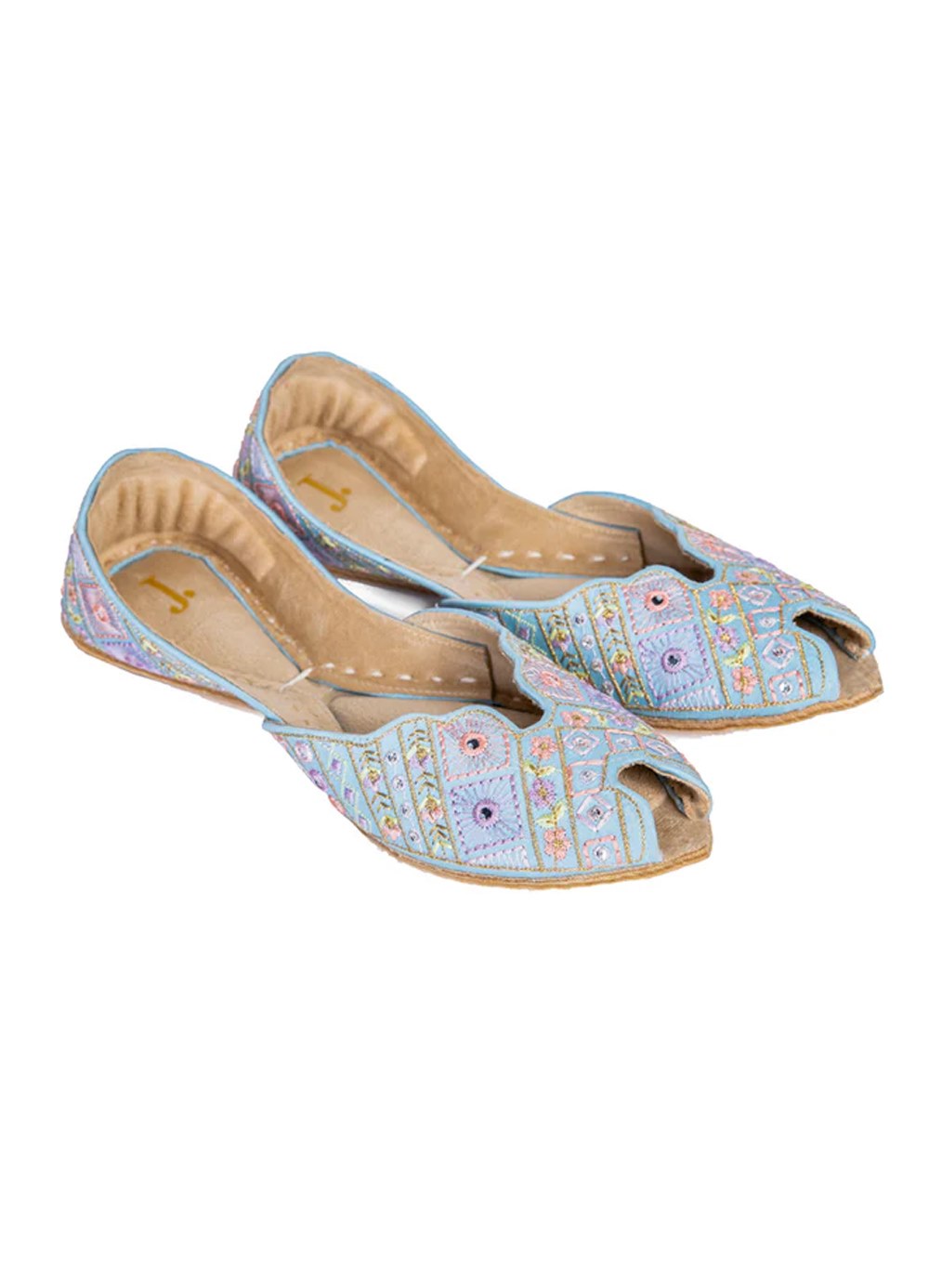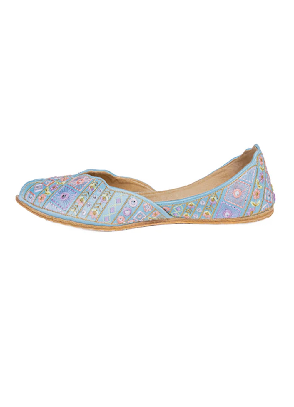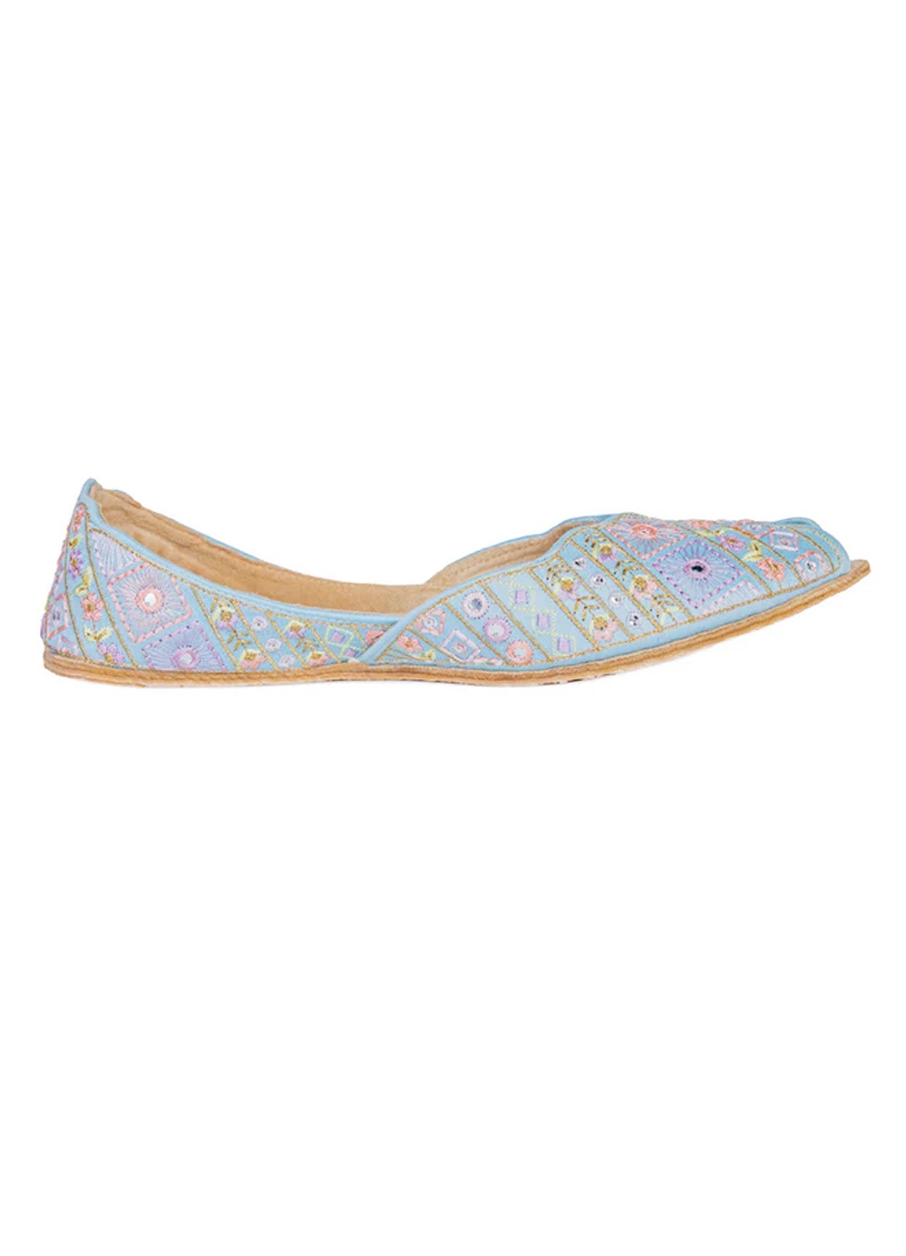 Blue Silk Khussa :Embrace a soft, whimsical aesthetic with these unique open-toe khussas. Dipped in a serene pastel blue, this pair features an intricate mosaic-style pattern of embroidered squares, delicate pink flowers, and shimmering mirror-like accents.