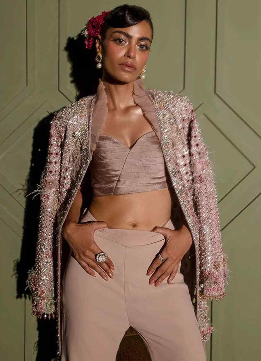 This modern raw silk jacket with flared georgette pants features detailed embellishments with silver and pink crystals, Swarovski elements, and delicate fabric motifs. Feather details add an edgy, avant-garde touch to this contemporary ensemble.