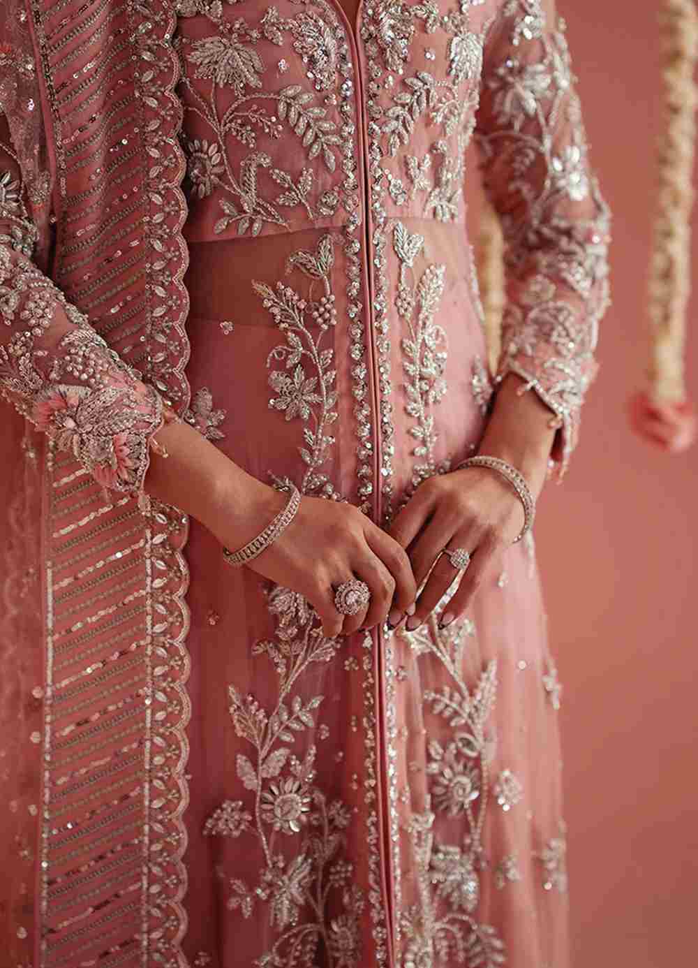 A dreamy blush rose net front-open shirt paired with a chiffon lehnga and a net dupatta. The ensemble features intricate silver and pearl embroidery with floral vines and sequined details, creating a romantic, ethereal look ideal for daytime receptions.