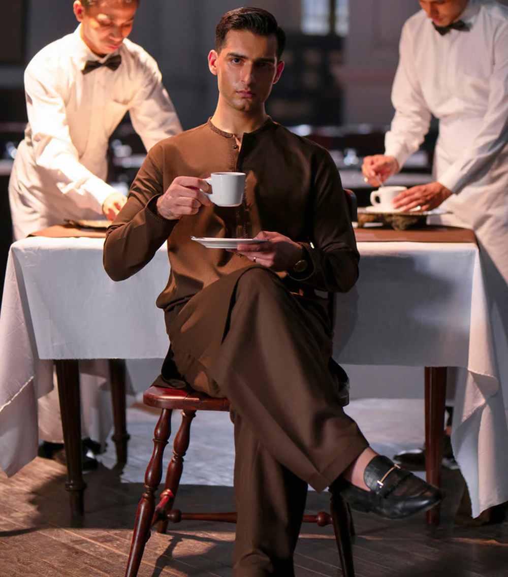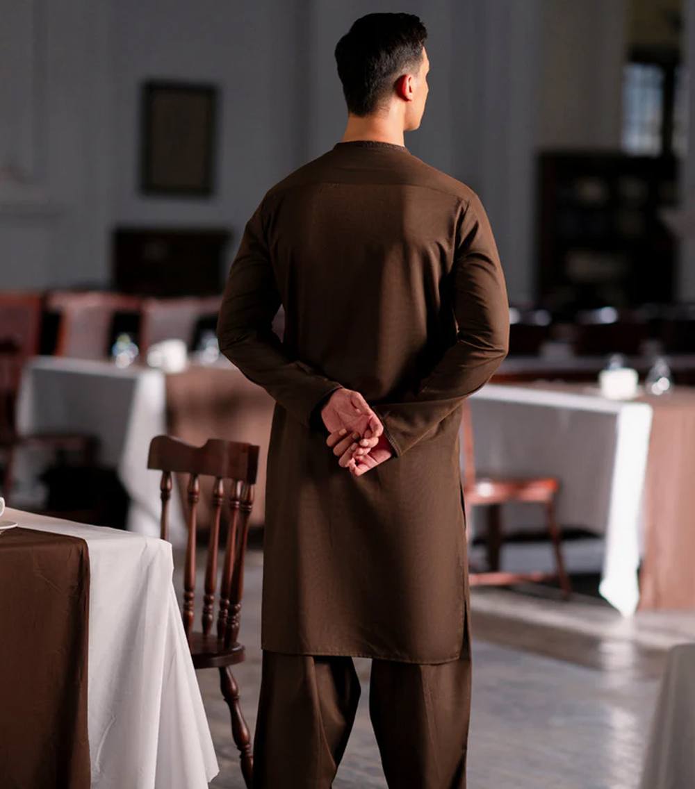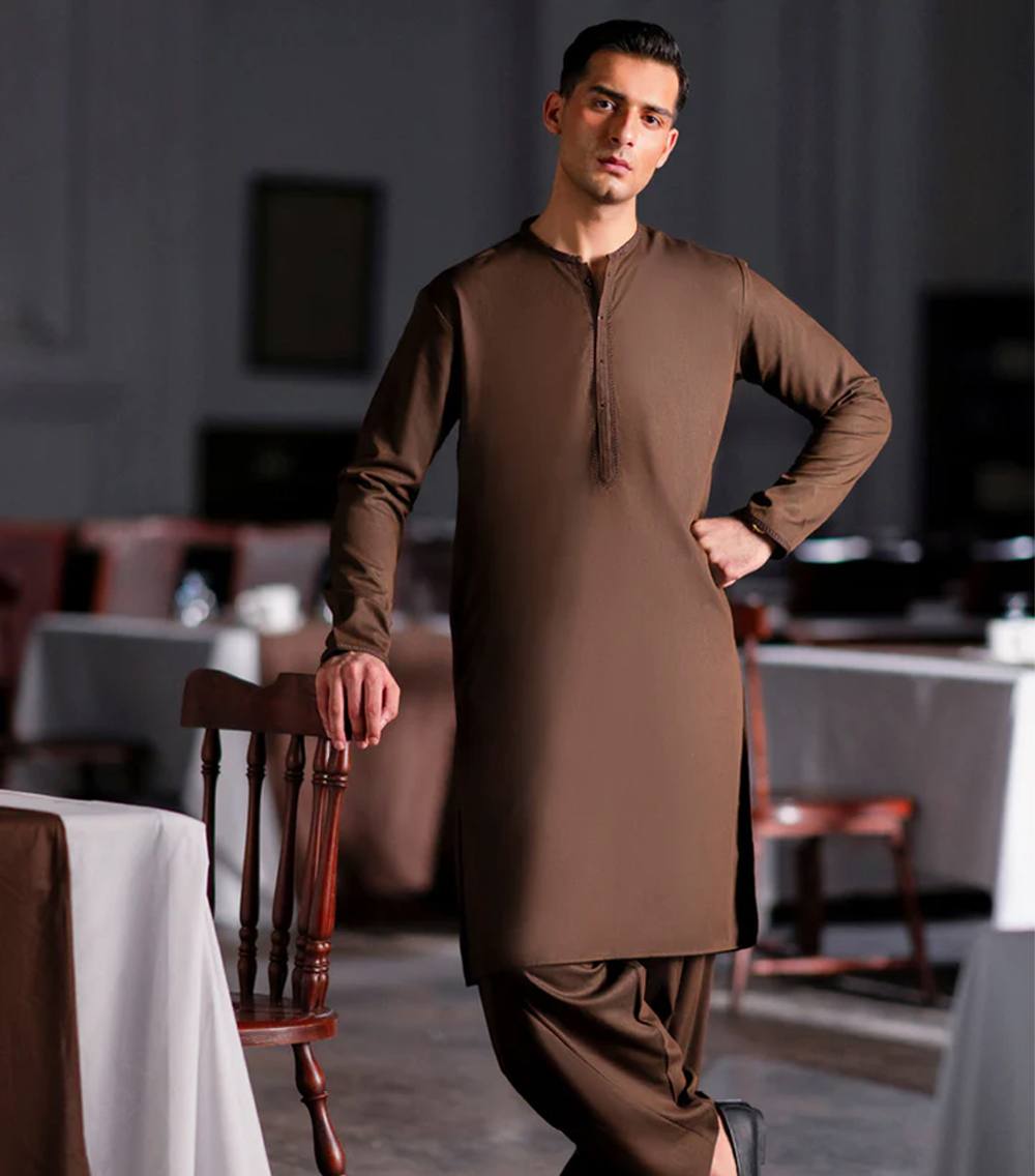 This brown blended semi-formal kameez shalwar offers a neat, stylish look that works well for family gatherings, dinners, or casual events. Easy to wear and effortlessly smart.