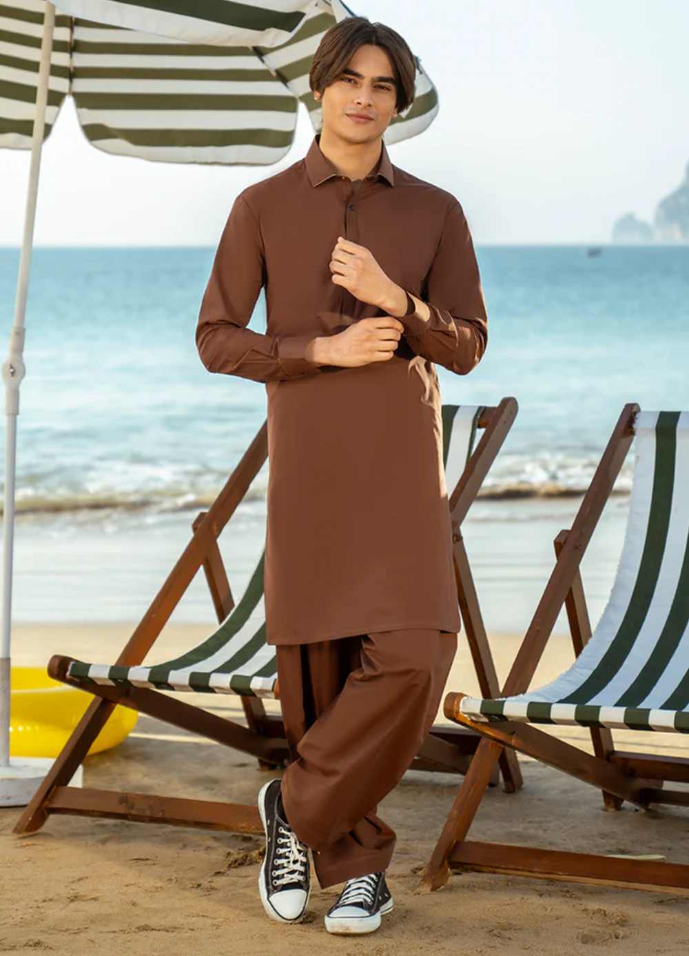 A perfect fusion of tradition and contemporary fashion, this Brown Cotton Kameez Shalwar for teen boys exudes effortless style. Its classic appeal offers versatility, suitable for a wide range of events and environments.