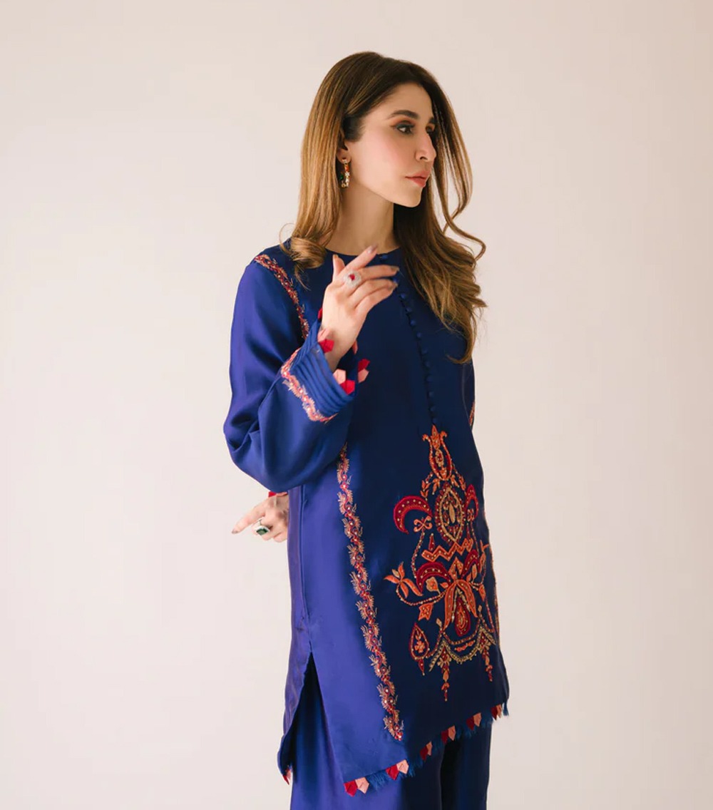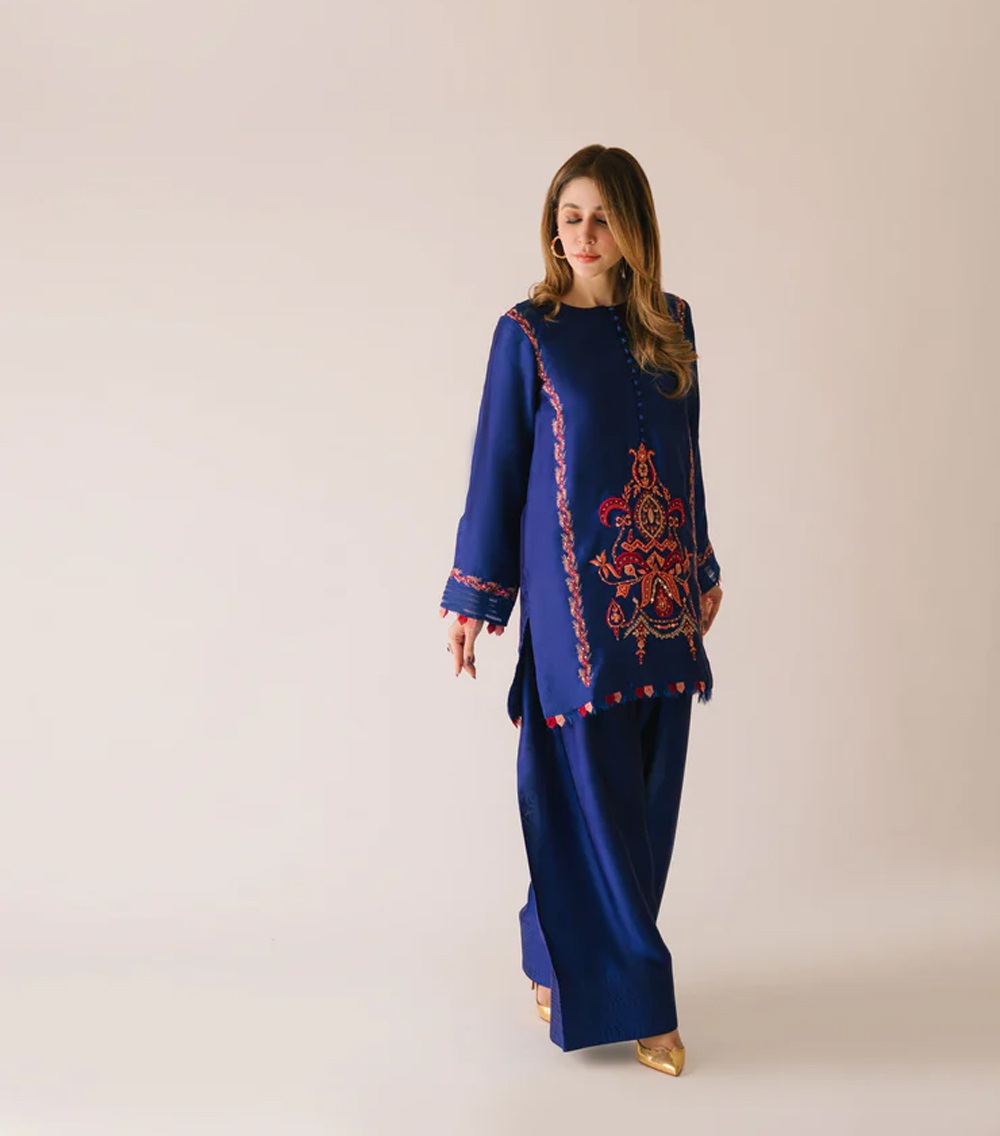 Paired with a pure sheesha silk ink blue farshi shalwar