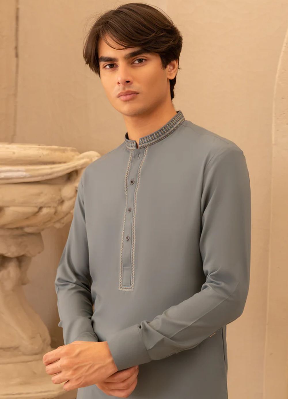 Designed with the young gentleman in mind, this dark cyan blended semi-formal kameez shalwar exudes charm and sophistication. Its classic yet stylish look offers versatility, perfect for both casual and formal occasions.