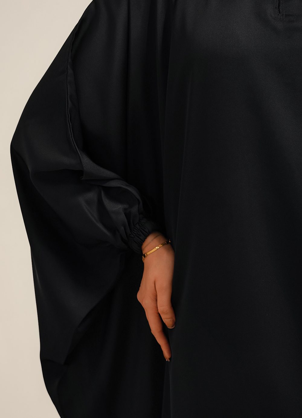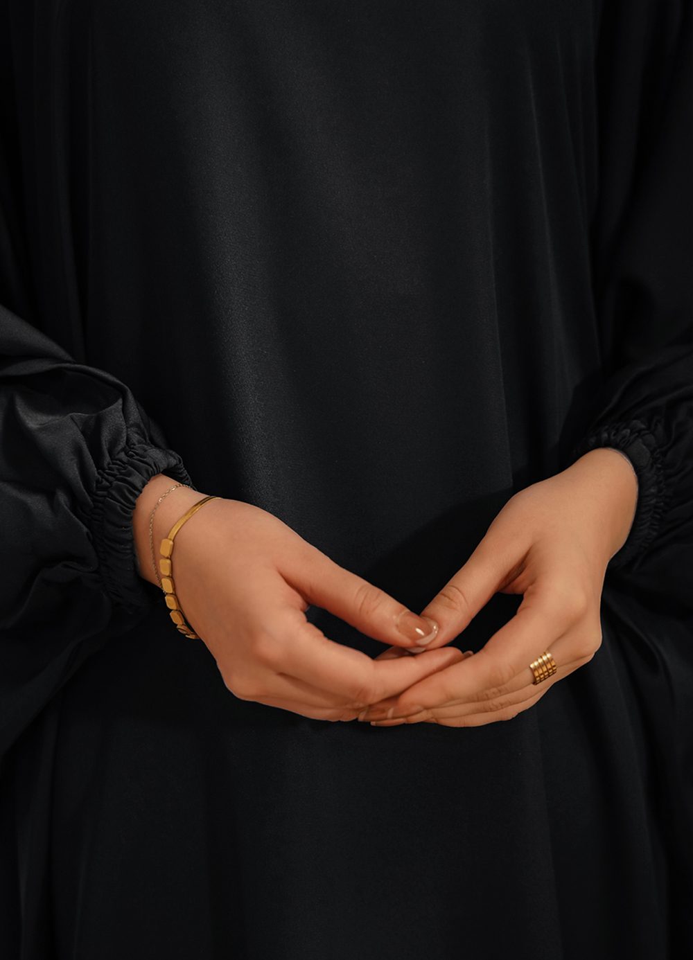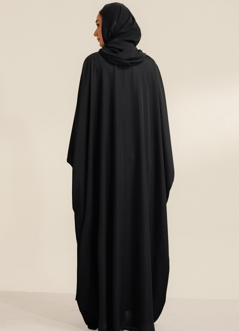 This abaya features a flowy butterfly cut with gathered sleeves, offering a relaxed silhouette.