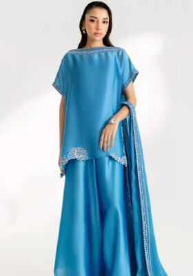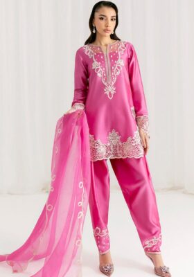 Crafted in a soft peachy orange tissue silk, this ensemble radiates subtle sophistication. Delicate resham embroidery adds a touch of traditional charm, while the laser-cut border brings a modern, refined finish. Paired with a beautifully embroidered pure organza dupatta, this look is the perfect blend of elegance and contemporary design.