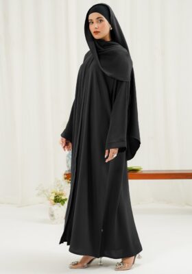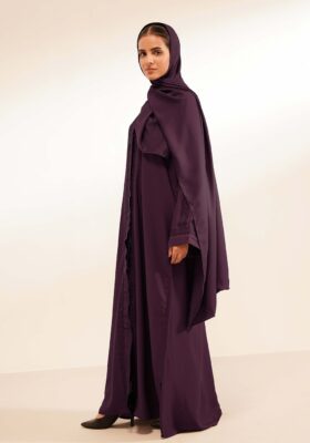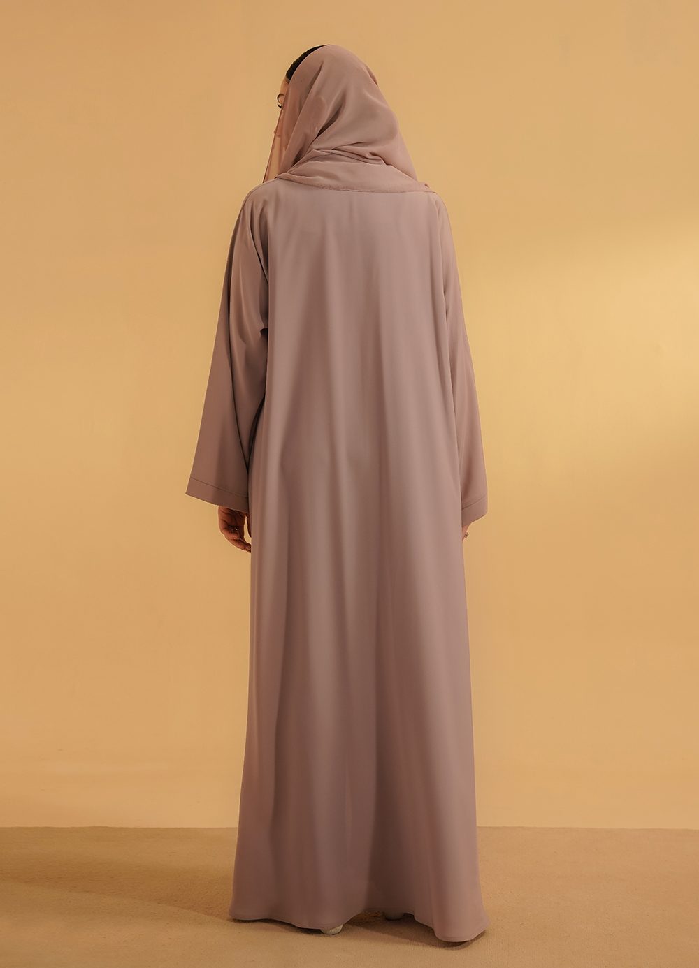 This abaya showcases a sleek A-line silhouette with delicate vertical embellishments that elongate the figure beautifully. The soft mauve tone and fluid fabric add a touch of understated elegance, perfect for refined, modern sophistication.