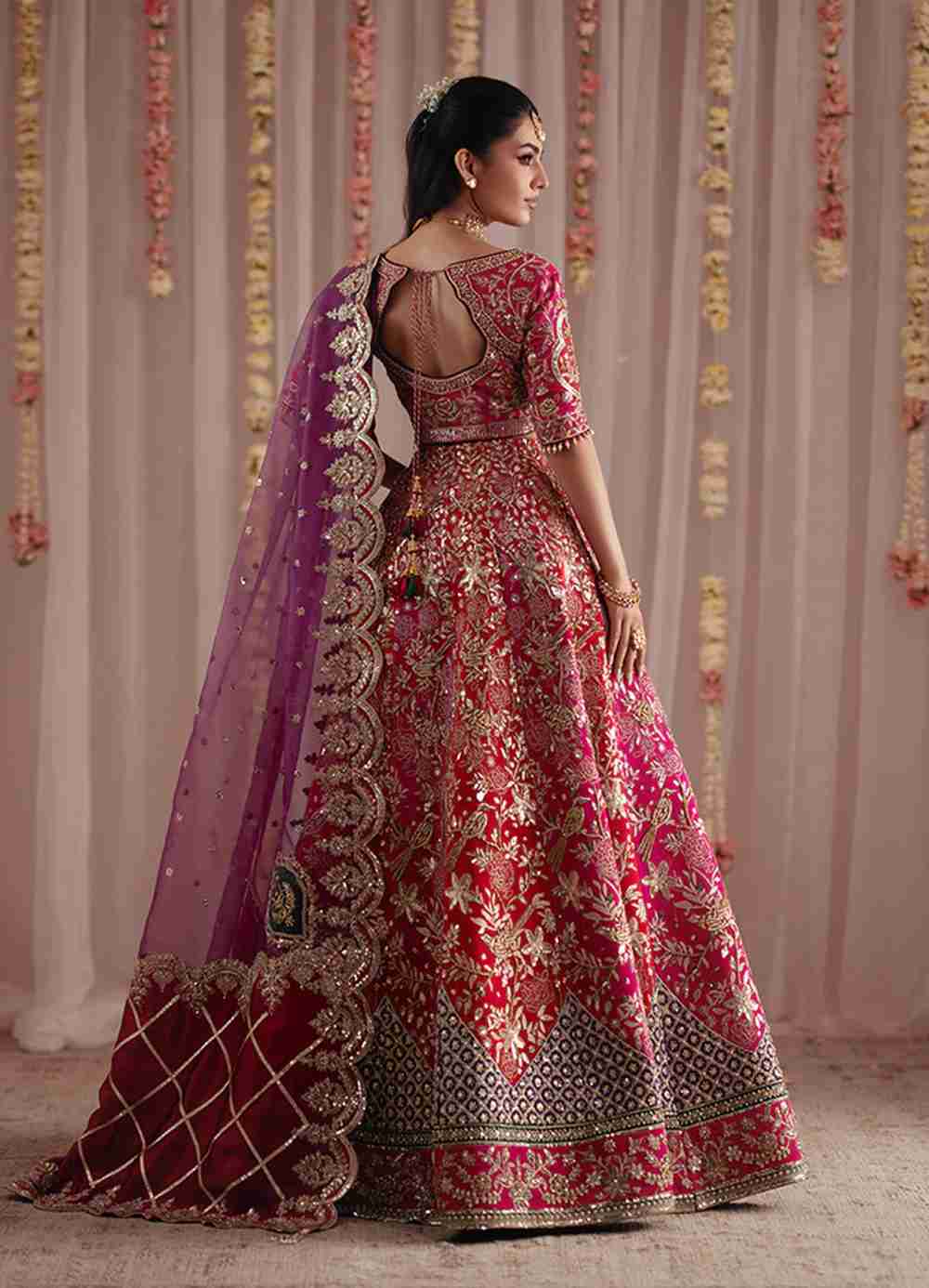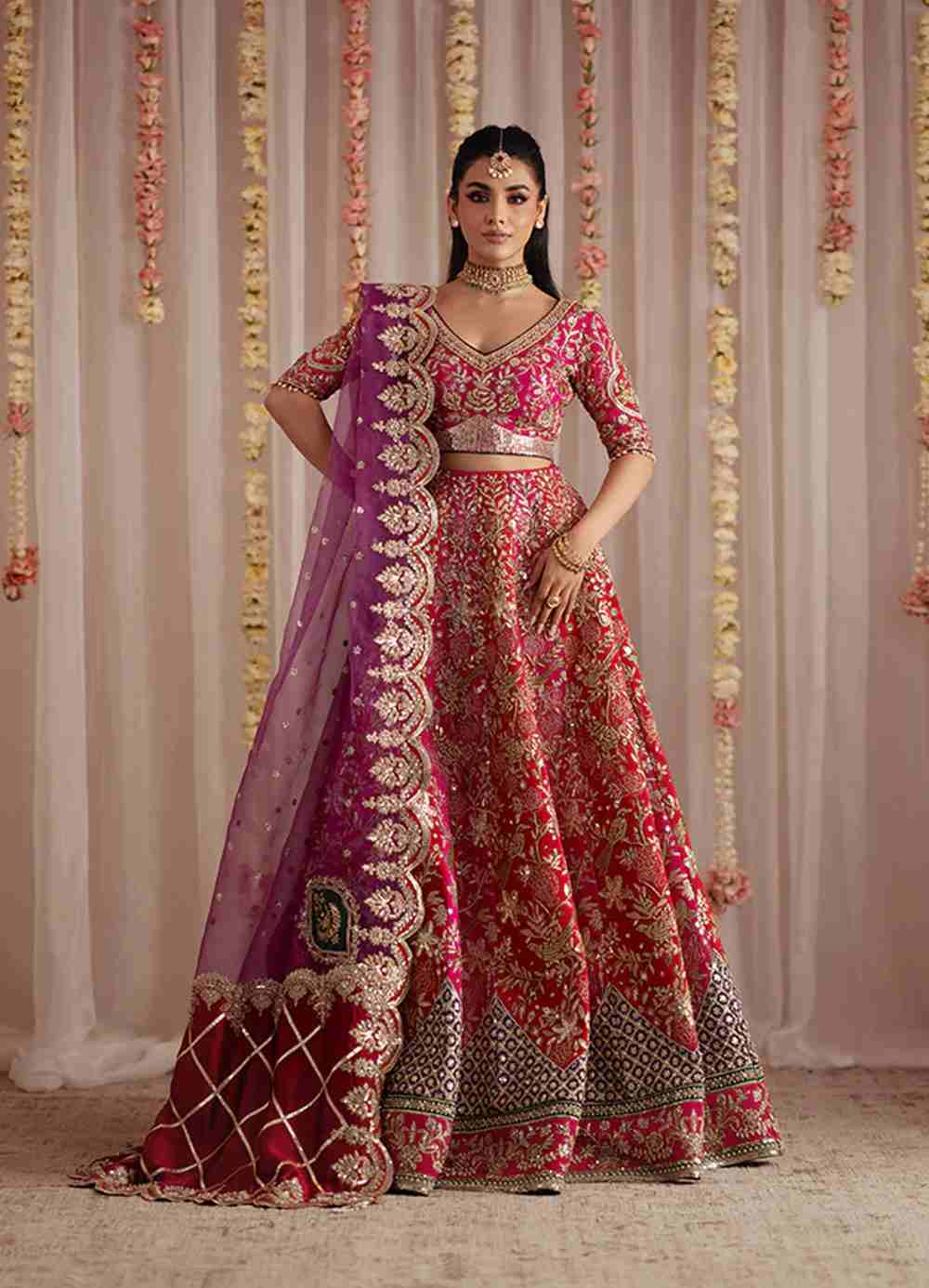 A striking fuschia and red raw silk lehnga choli featuring intricate aari embroidery with dabka, kora, and sitara work. The vibrant color palette is accentuated with purple and emerald accents, complemented by an organza dupatta with gota patti pallu borders and bold motif patches radiant and festive.