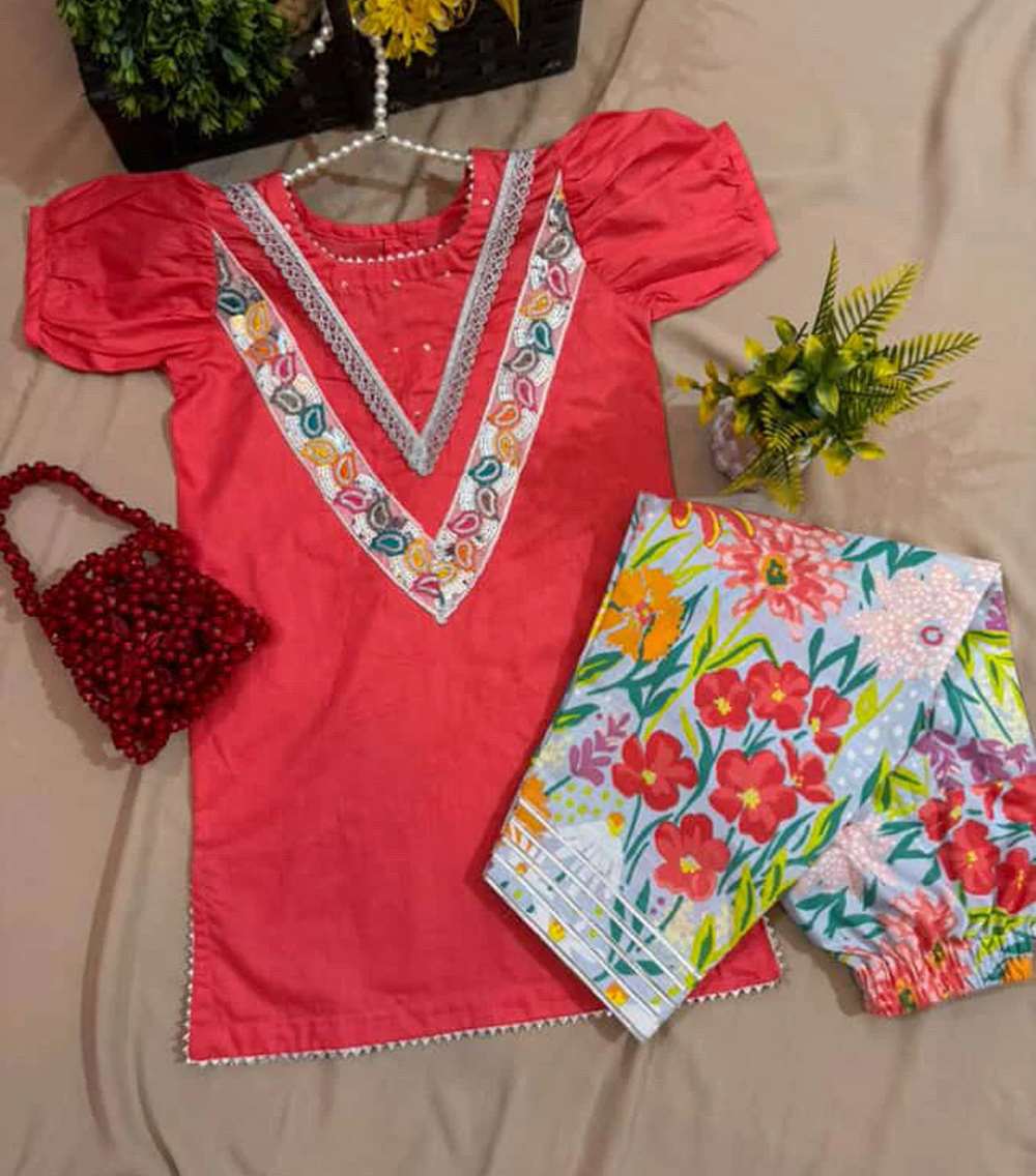 Add a splash of fun to her wardrobe with this Girls Orange Farshi Shalwar. Featuring a vibrant floral print shawl paired with a solid shirt, it’s beautifully embellished with delicate laces and sparkling sequins.