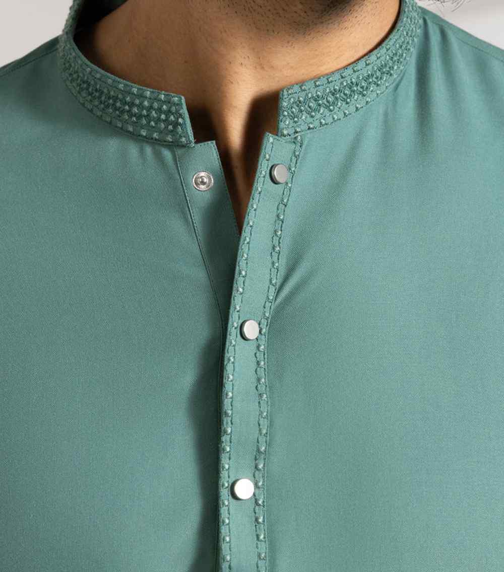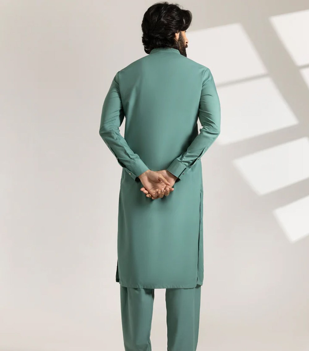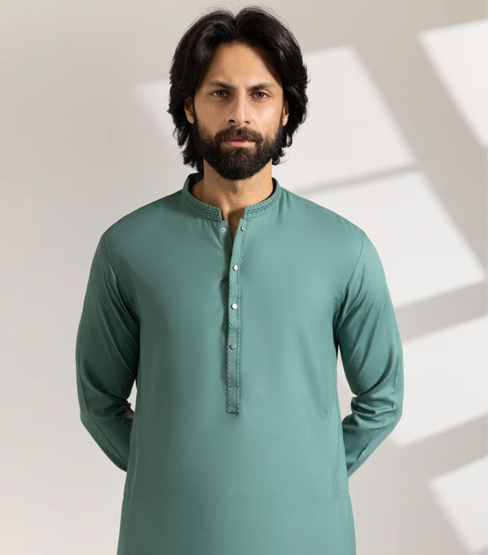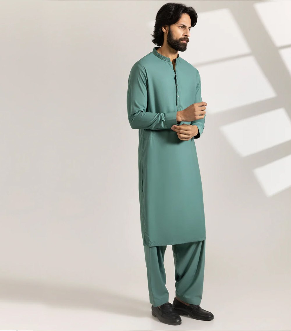 A classic eastern wear set designed with clean stitching and thoughtful detailing. The Green Blended Semi-Formal Kameez Shalwar offers a neat look & comfortable fit – ideal for long wear, daily use, or special occasions with a touch of tradition.
