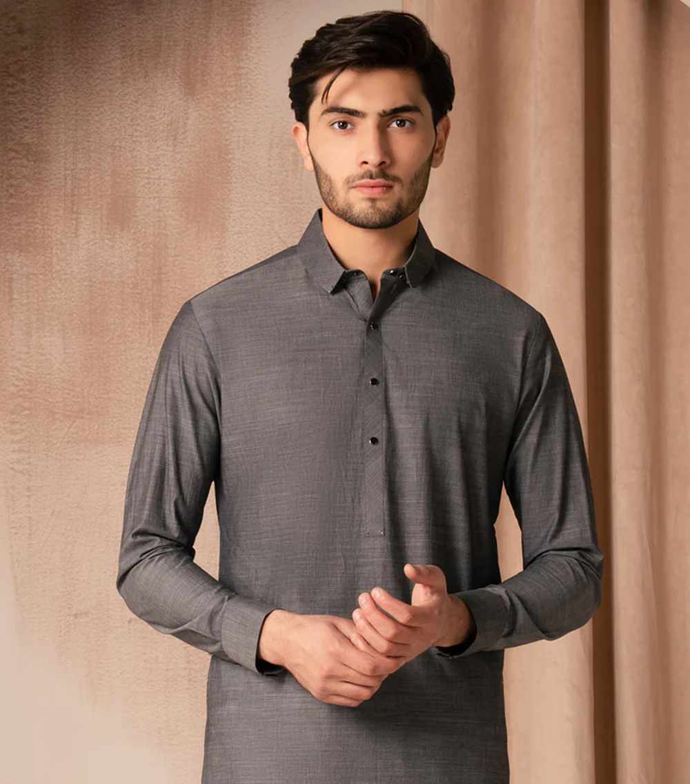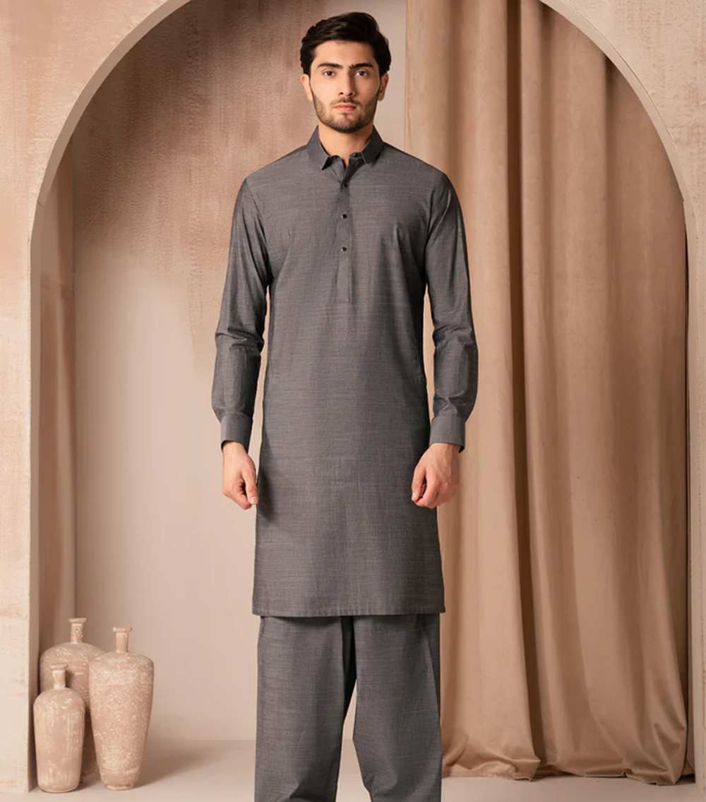 Traditional and simple, this grey cotton casual kameez shalwar is made for comfortable daily wear and relaxed occasions.