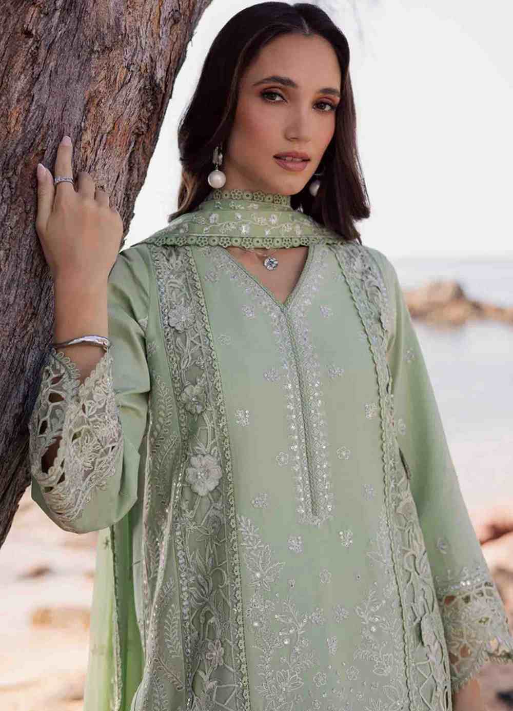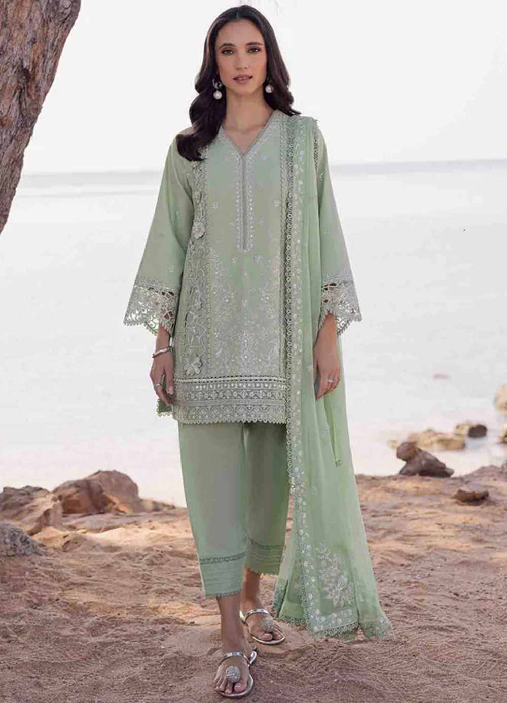A soft mint green kurta with a relaxed silhouette and fine tonal embroidery. The neckline and side panels feature delicate silver tilla work with geometric detailing and 3D floral motifs. It is paired with a tapered shalwar finished with lace accents and an airy chiffon dupatta, edged with a subtle floral vine border and light booti spray.