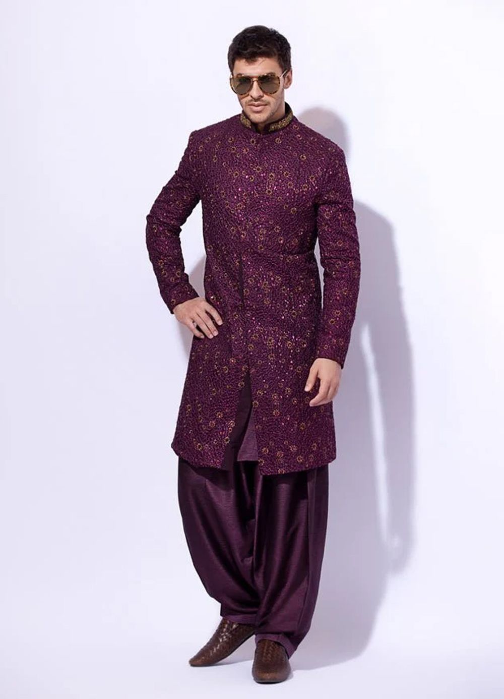 Color : Wine Elevate your sartorial finesse with our opulent Plum Color Self-Embroidered Sherwani. Crafted with painstaking detail, it boasts exquisite Zardozi work on the elegant Ban collar, offering a taste of true luxury. This sherwani, resplendent in rich plum hues, is meticulously self-embroidered to perfection. Paired with a matching Plum Color Shalwar and a luxurious inner lining for comfort, this ensemble is the epitome of sophistication, making it the ultimate choice for weddings, grand celebrations, and formal events.