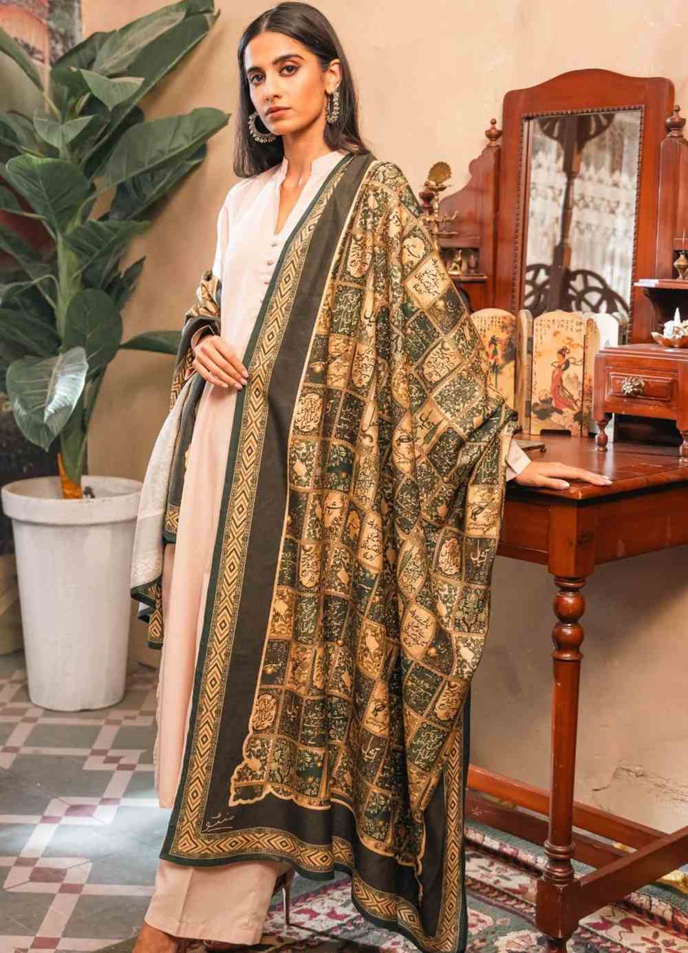 Cotton silk odhni features Urdu calligraphy of infamous poetry by Allama Iqbal. A reminder that small acts of kindness illuminate our world.