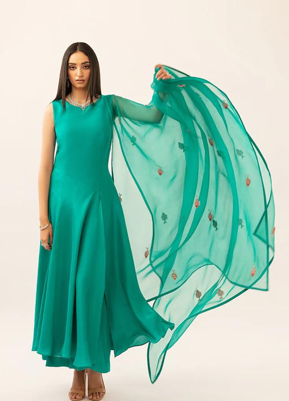 A captivating asymmetrical teal dress, expertly draped with a subtle side slit, harmoniously coordinated with pure raw silk azar pants. Enhance the ensemble with a pure organza dupatta beautifully adorned with fish-shaped motifs.