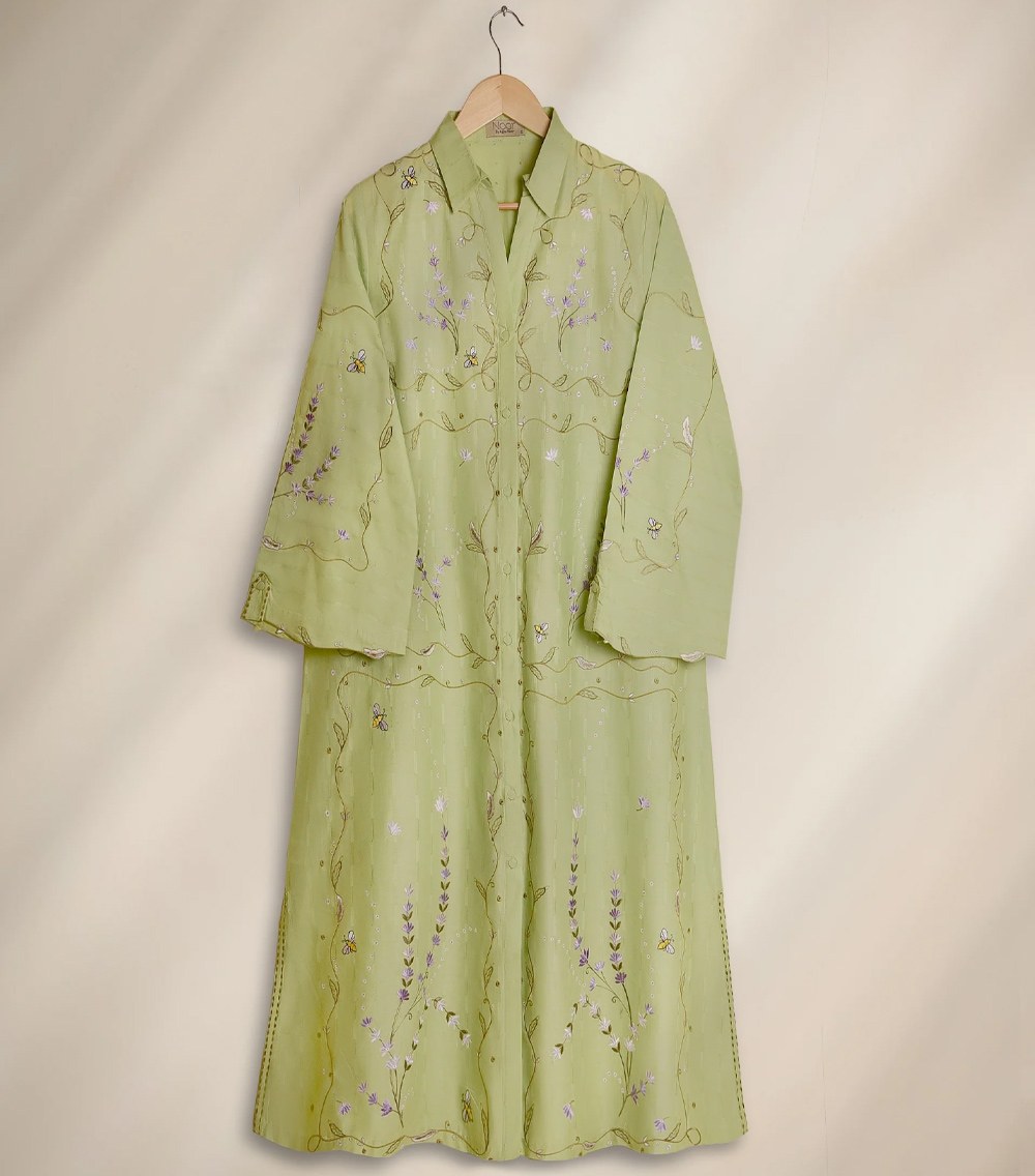 Embrace Serenity in Pistachio & Lavender Elevate your seasonal style with this signature piece from Agha Noor. This long-line kurta is rendered in a soothing shade of pistachio green, designed to offer both comfort and sophisticated charm.