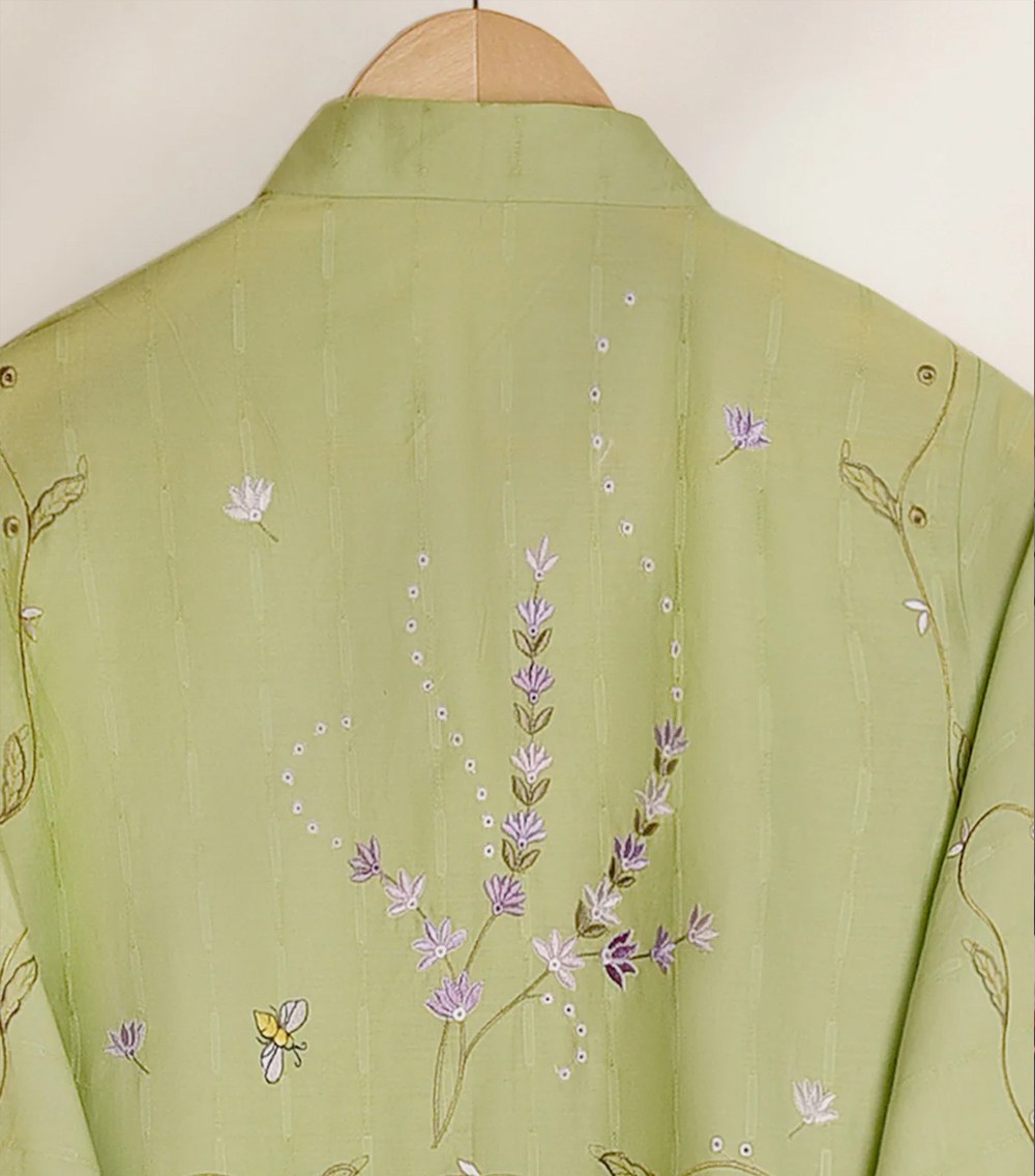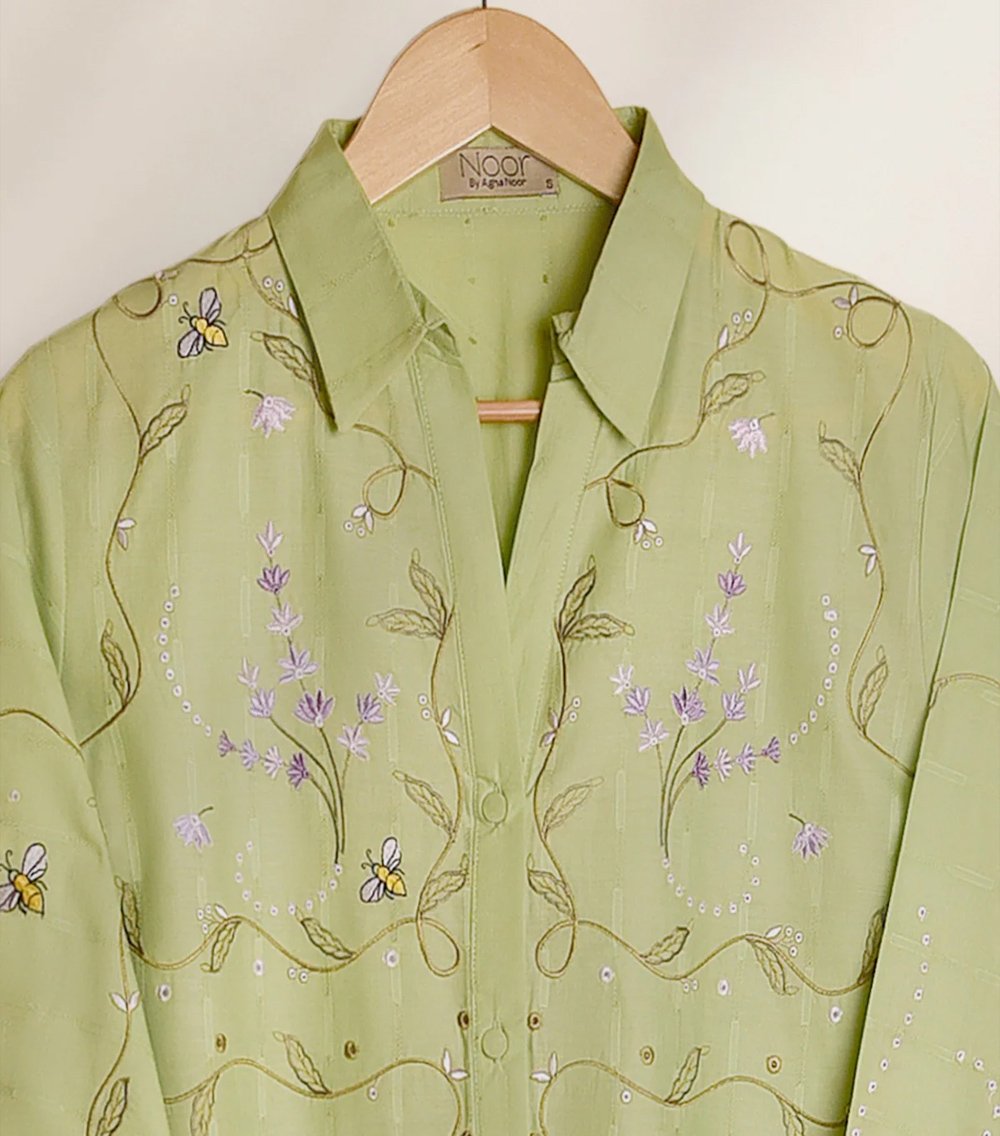 A breath of fresh air for your wardrobe, this Agha Noor Pistachio Green Kurta features exquisite lavender floral embroidery and whimsical bee motifs.