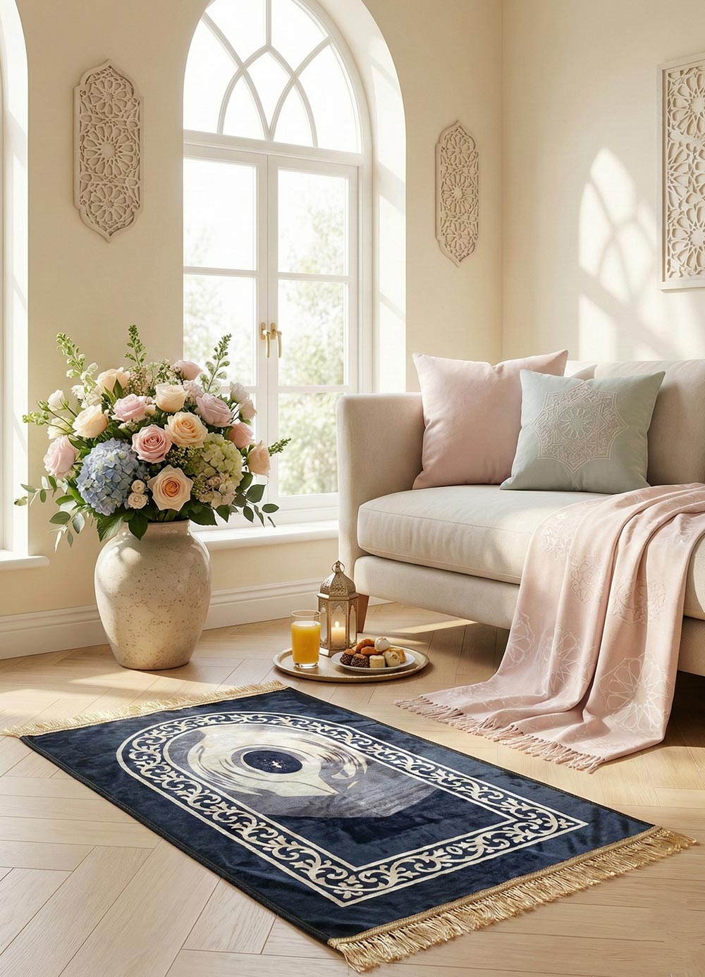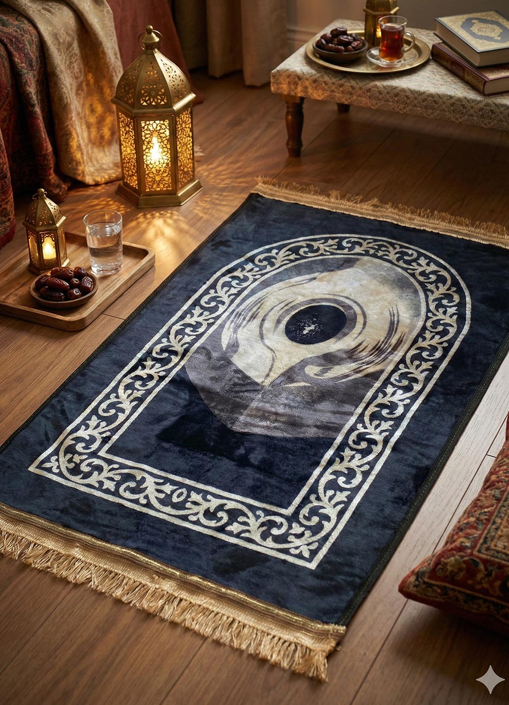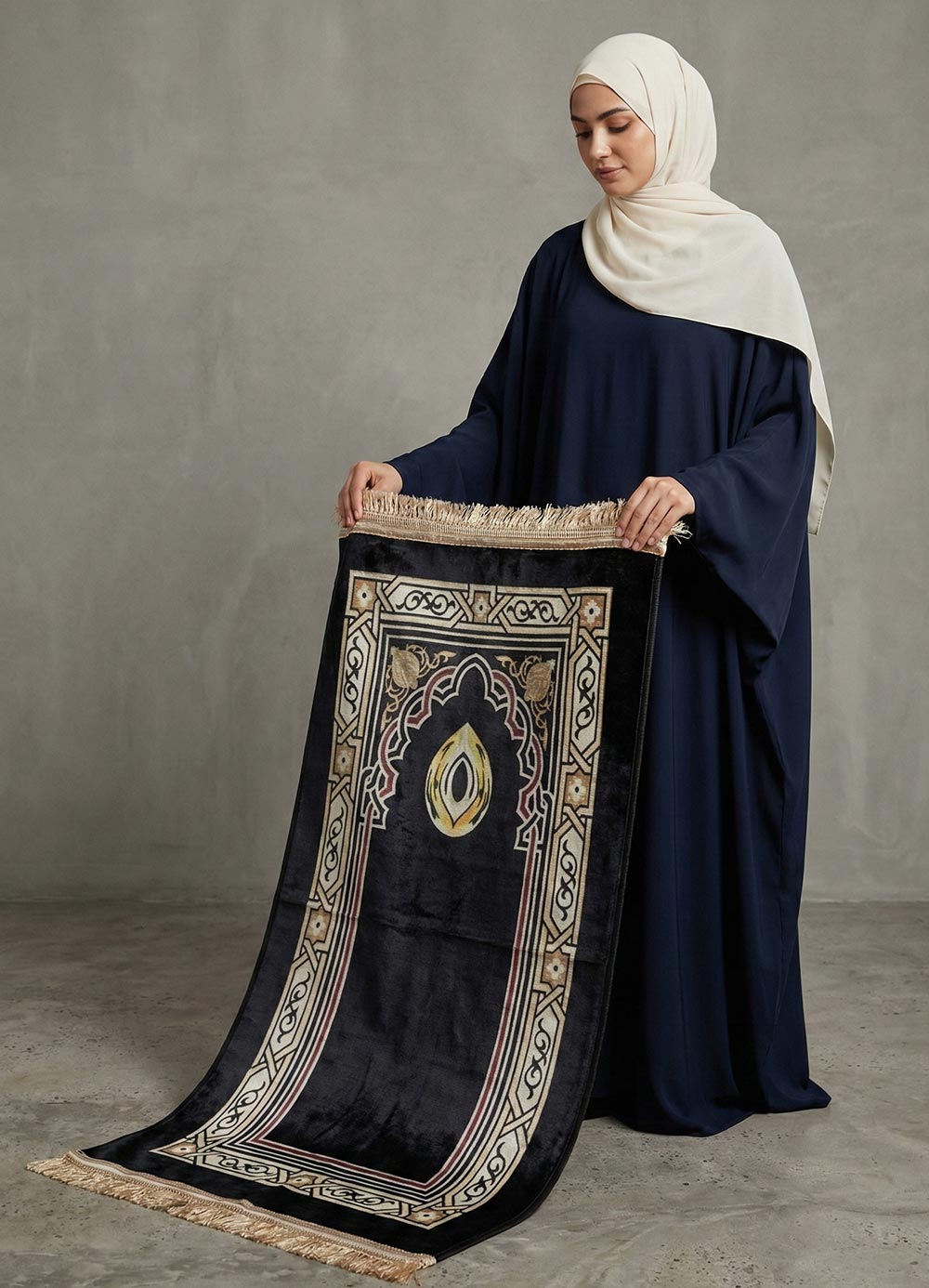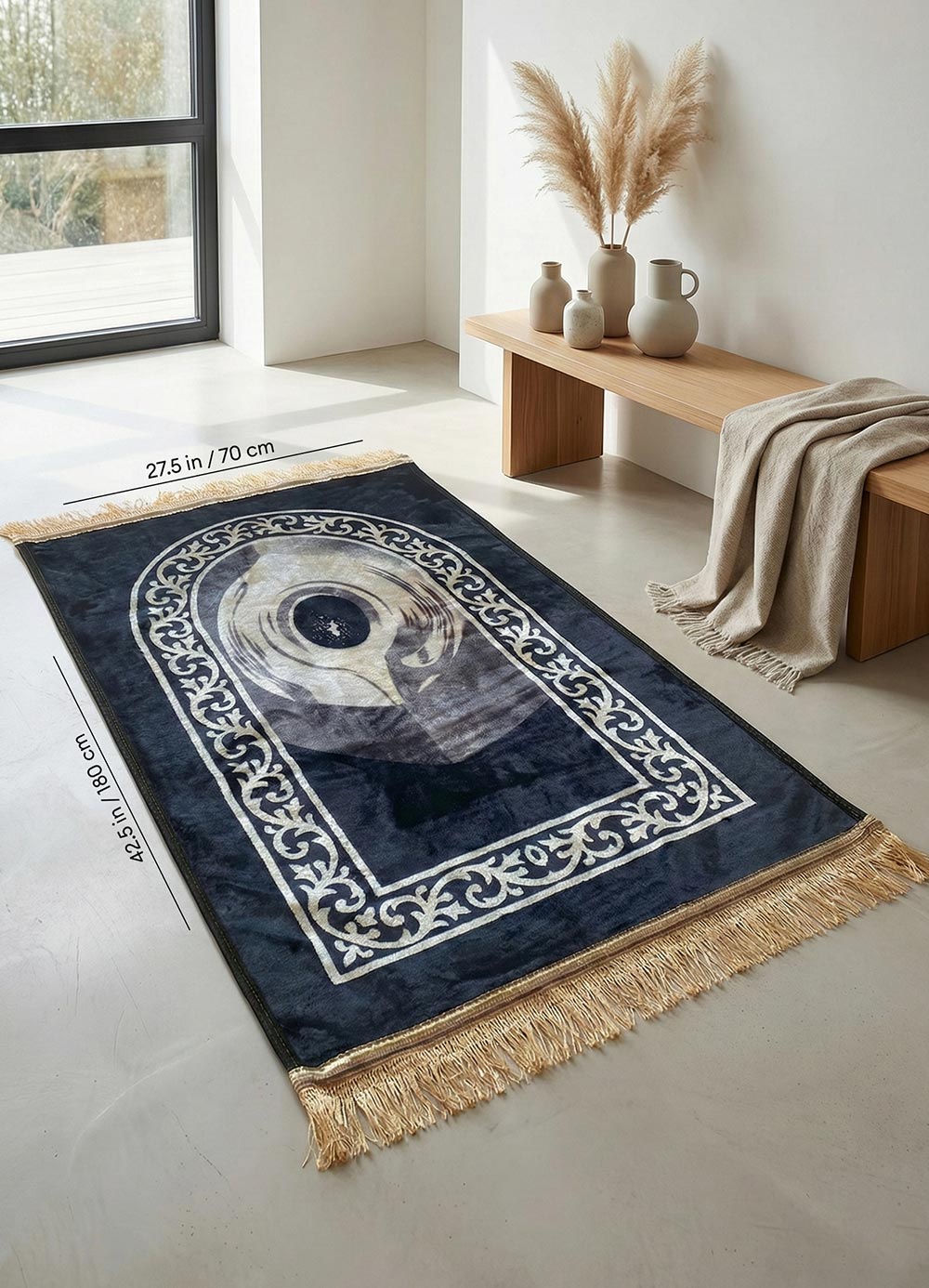 Transform your prayer space into a sanctuary of peace with our Premium Velvet Embossed Prayer Rug Collection.