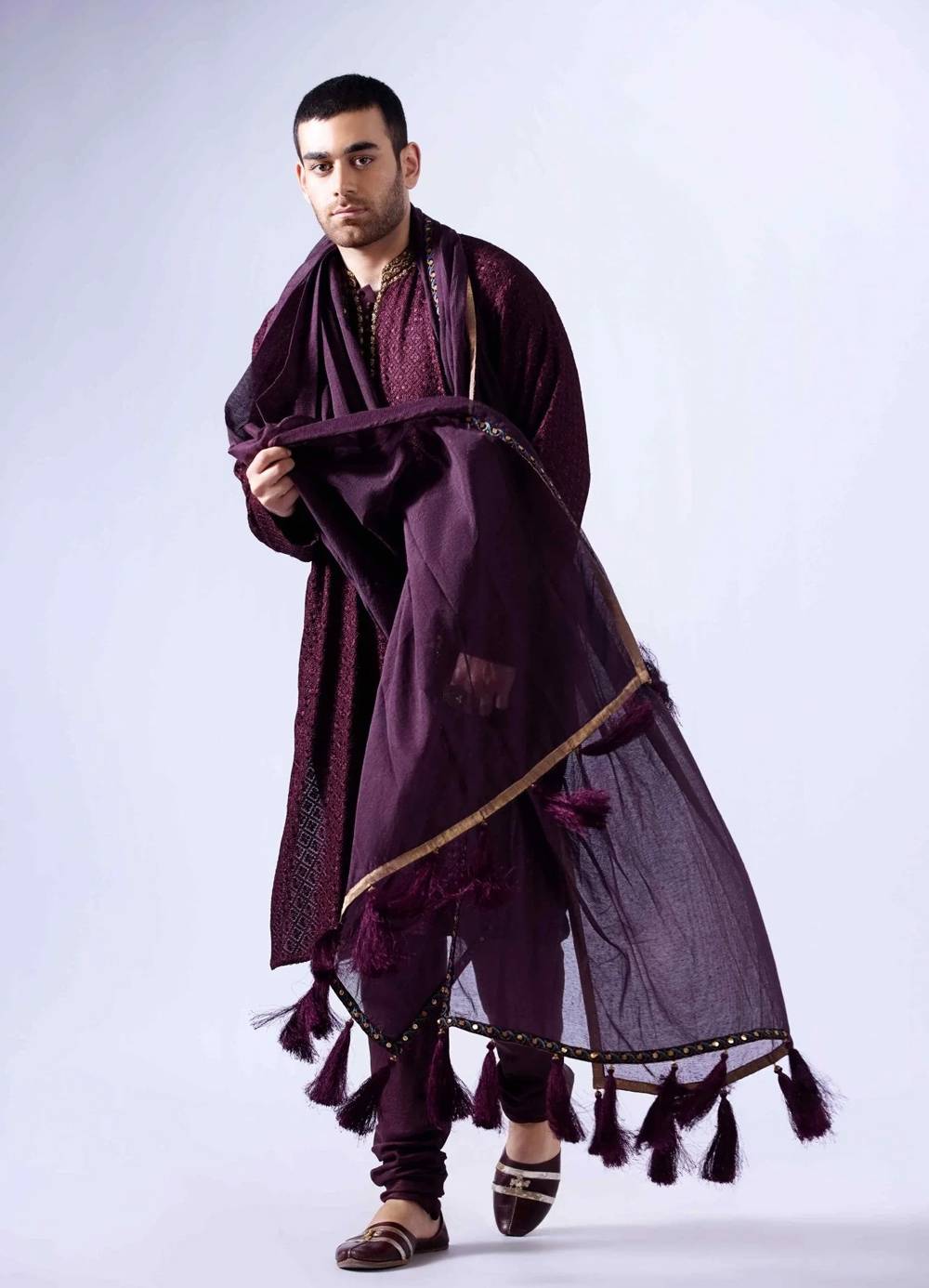 A rich maroon chiffon kurta, meticulously adorned with antique zardozi work along the neckline, enhanced by handcrafted custom buttons and a delicate chiffon lining. This exquisite ensemble is elegantly paired with korian raw silk pants, ensuring a seamless balance of style and comfort. Completing the ensemble is a cotton patka featuring an embroidered border and charming tassels, adding a touch of timeless elegance to this exceptional outfit tussles.