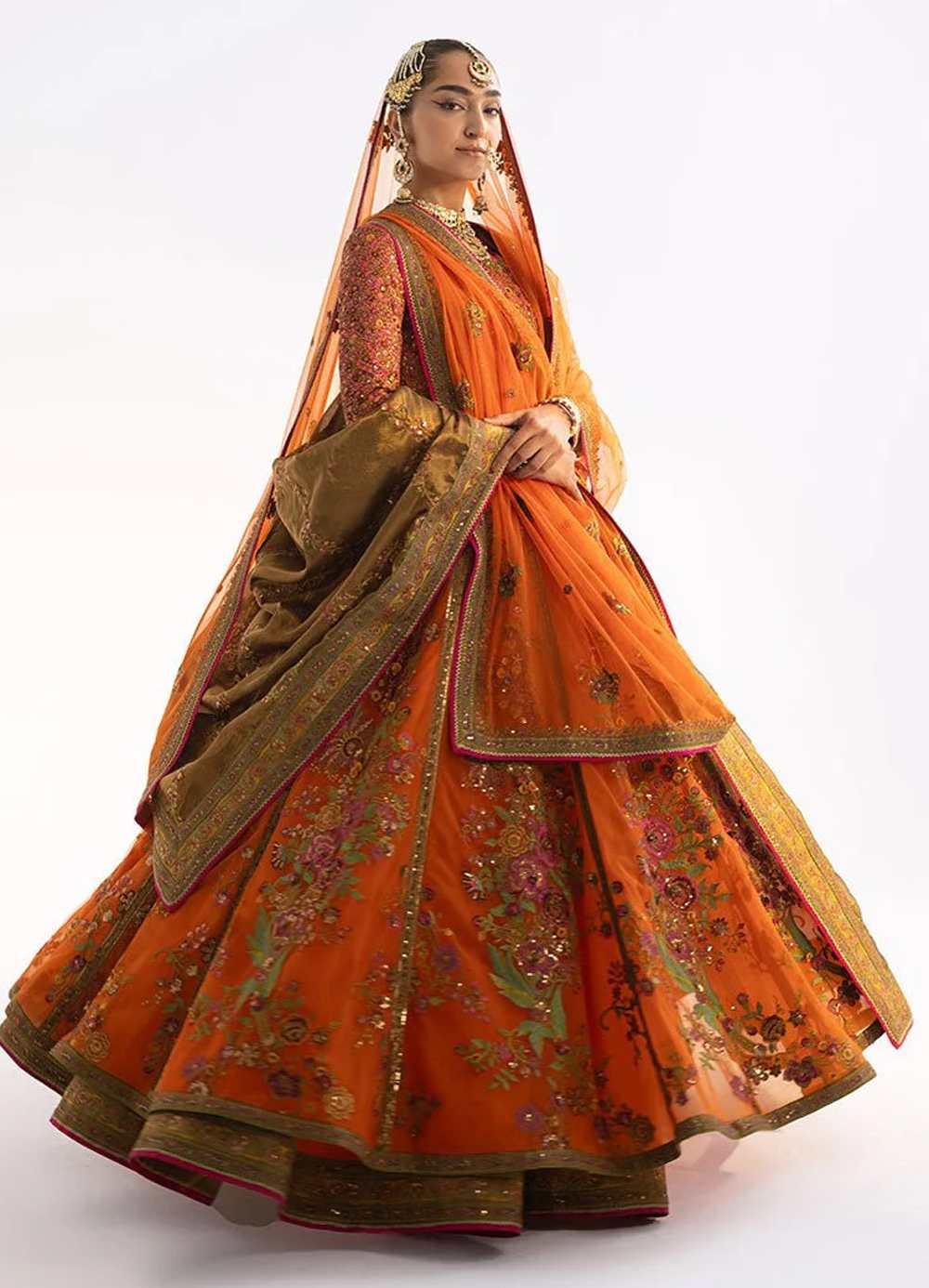 This rust-hued lehenga, crafted from luxurious net fabric, features intricate embroidery and a bold border for added drama. The choli, a full jaal design, is adorned with embellishments along the neckline and hem, while attached sleeves with a matching border add extra flair. Paired with a dreamy net dupatta, finished with delicate embroidery and a coordinating border, this ensemble blends royal opulence with modern charm, perfect for formal occasions.
