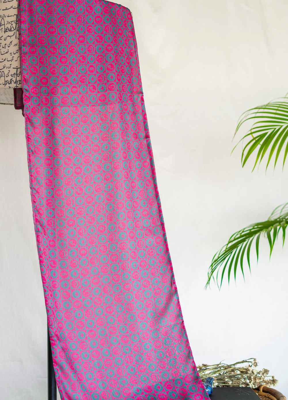 Double-Side Printed Crinkle Silk Stole Featuring Urdu Letters Calligraphed Throughout.