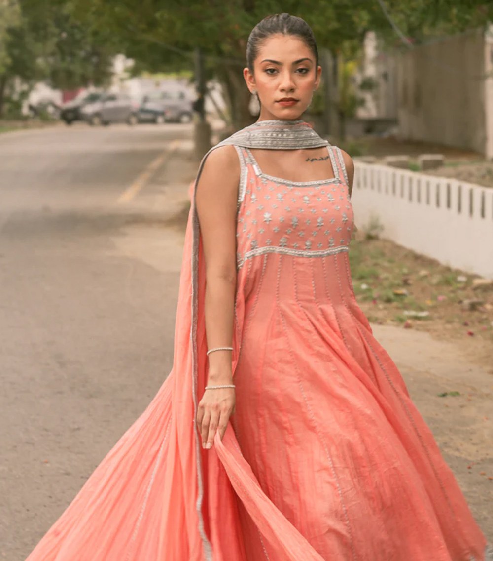 This chic 2-piece set includes a strap Peshwaz and a gota finished dupatta in a soft peach shade, made from luxurious malmal fabric. The Peshwaz is beautifully embellished with gota work, adding a subtle yet radiant touch to the outfit. Perfect for a festive occasion, this ensemble blends elegance and comfort effortlessly.