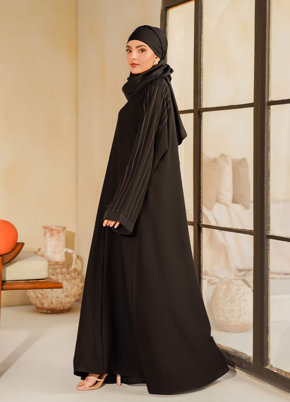 Abaya features a loose, flowy cut with hidden front buttons and elegant linear detailing on the sleeves and back.