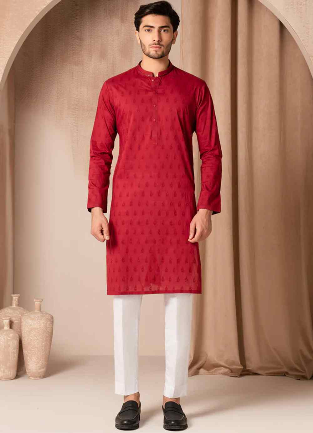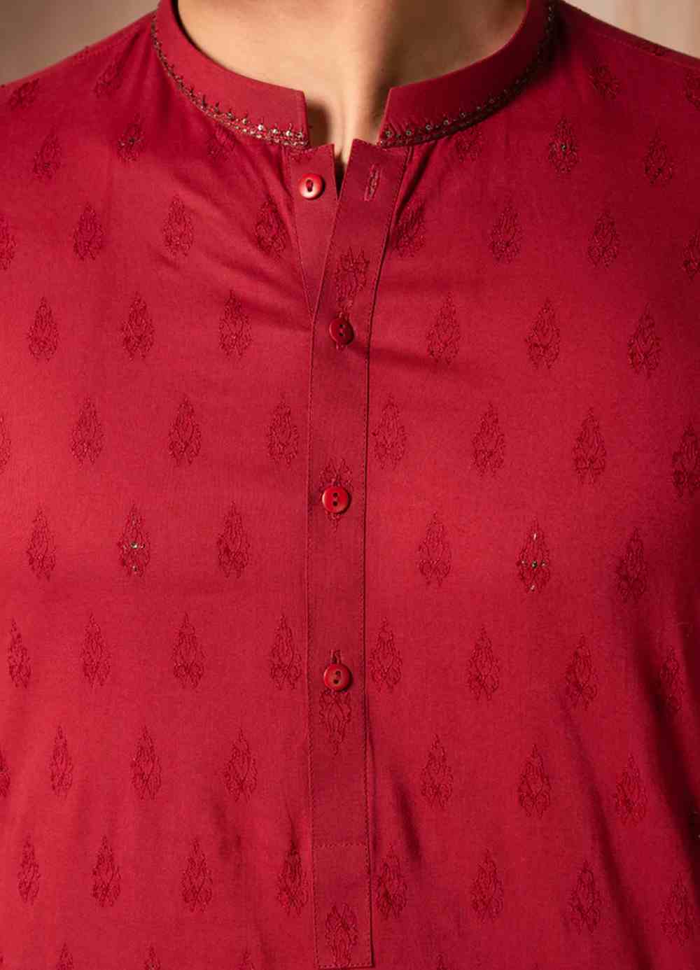 A classic eastern wear set designed with clean stitching and thoughtful detailing. The maroon cotton semi-formal kurta offers a neat look & comfortable fit – ideal for long wear, daily use, or special occasions with a touch of tradition.