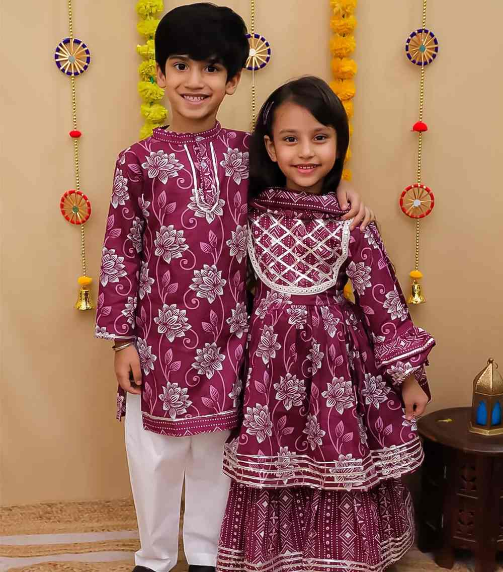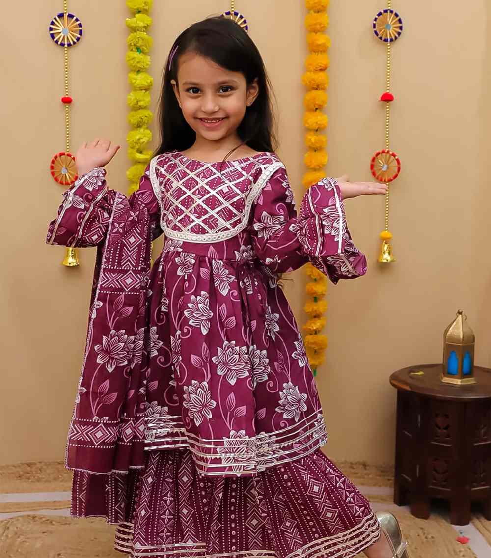 This playful girls’ Plum Kurta Sharara Suit features a heavy, rich cotton kurta paired with comfortable sharara pants, perfect for twirling and festive fun.