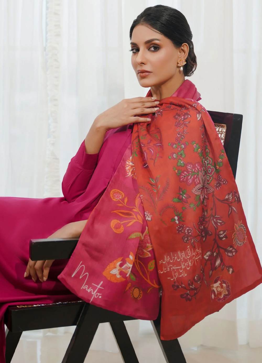 Printed double-sided crinkle silk stole featuring Urdu calligraphy of Poetry by Allama Iqbal, & beautiful floral print on both sides.