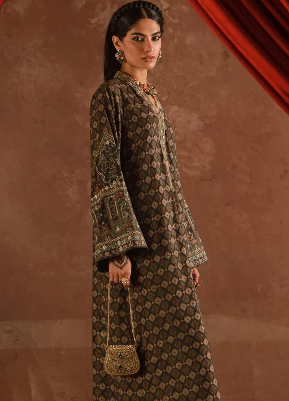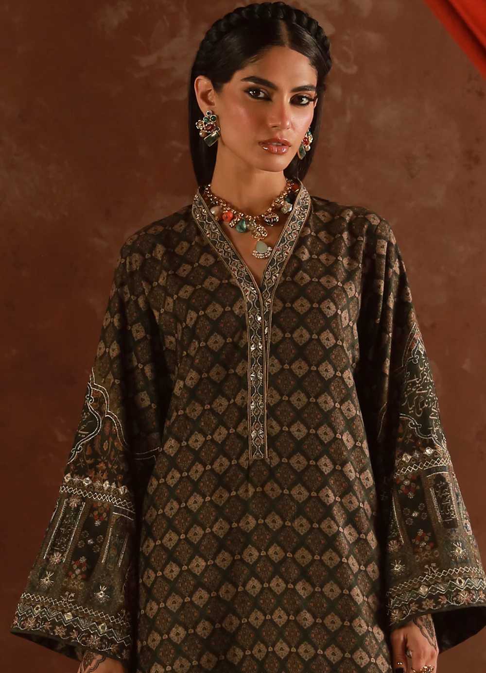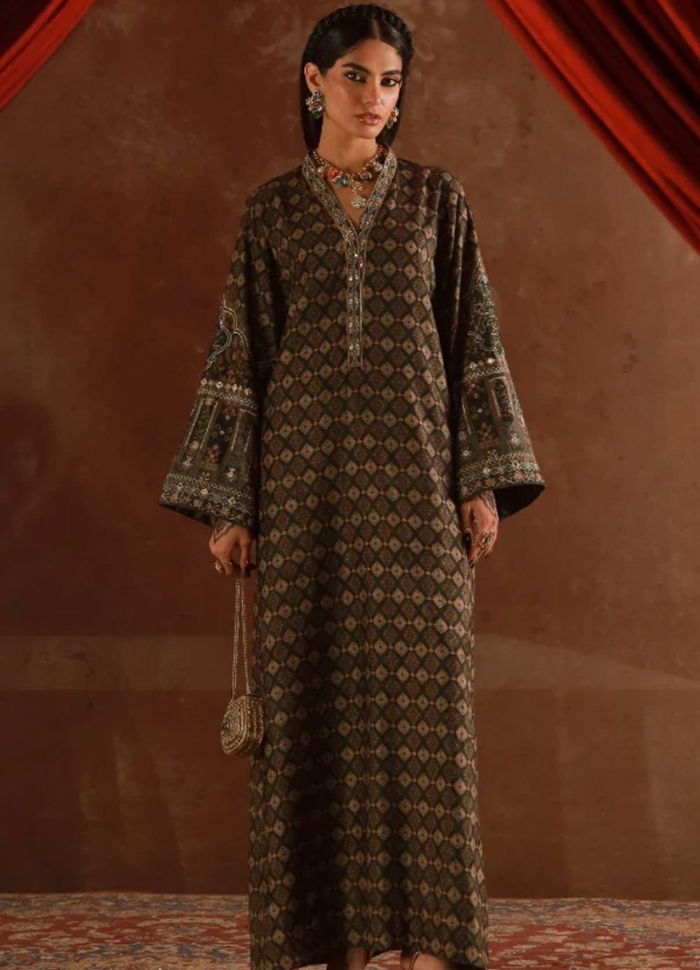 Premium Velvet Kaftaan with embroidery on the neckline, zari and sheesha on the sleeves. Featuring the words of Nida Fazli.