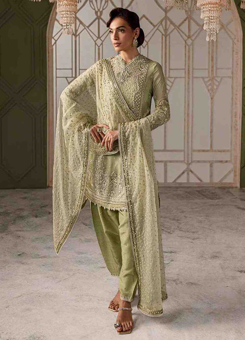 A short, mint green chiffon shirt with gorgeous floral and crystal motifs, enhanced with seed pearls, and silver and gold sequins. It’s matched with a tapered raw silk shalwar and a beautiful, organza dupatta that’s bordered with intricate detailing to bring a graceful vibe to the whole look.