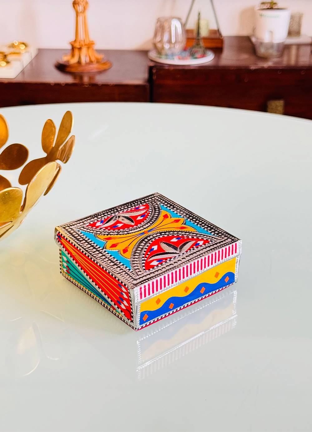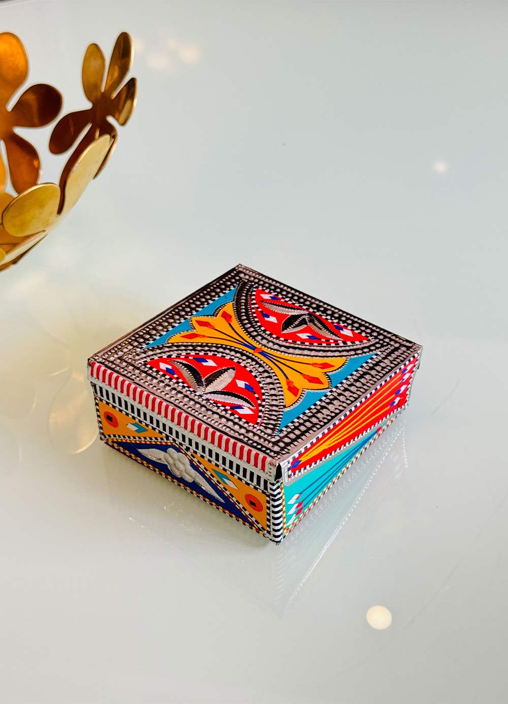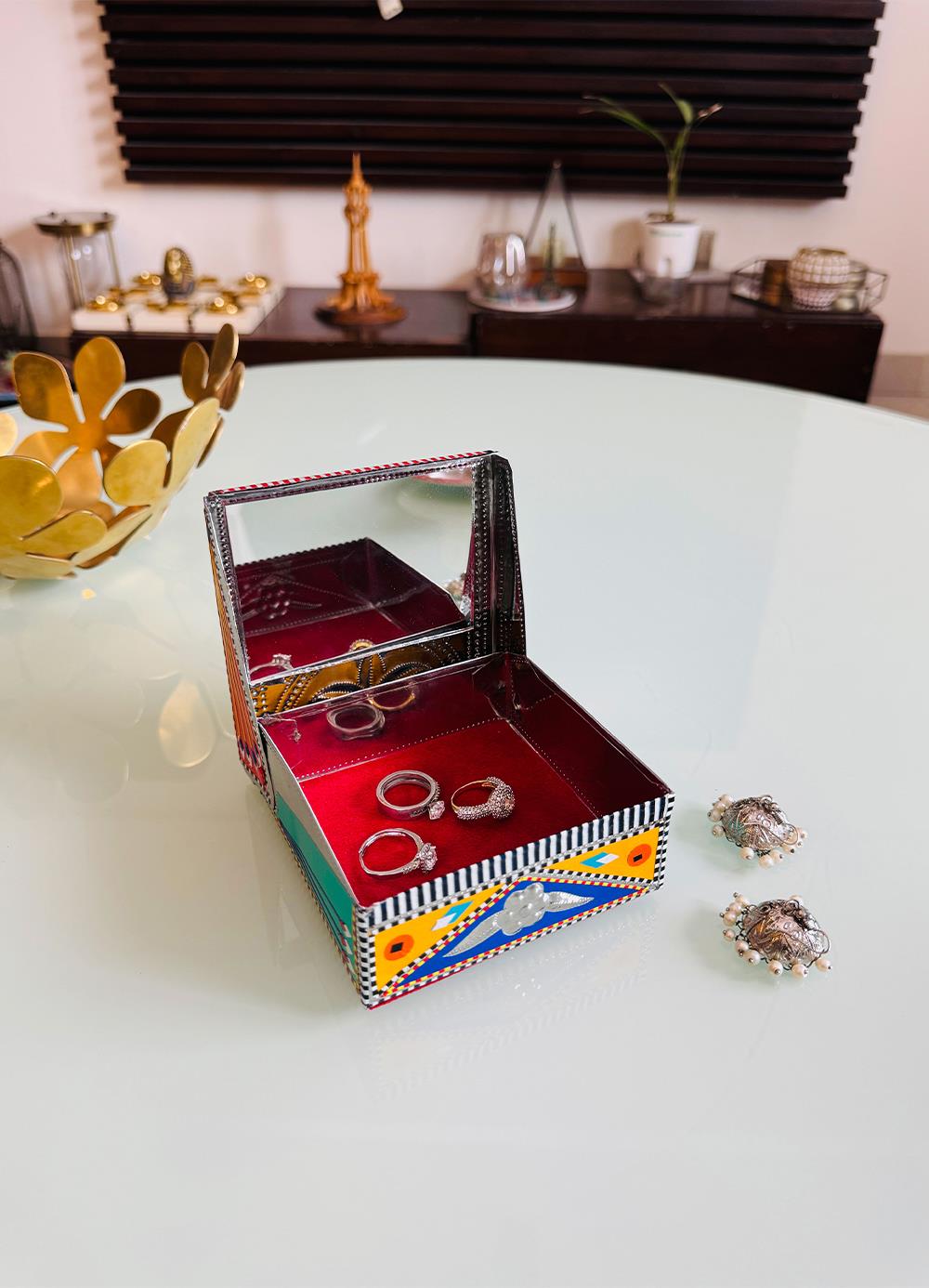 Brighten up your space with our Chamakpatti Jewelry Box. Decorated with vibrant truck art, this box is perfect for storing your jewelry and adding a pop of color to your room. Celebrate traditional craftsmanship with this unique and practical piece.
