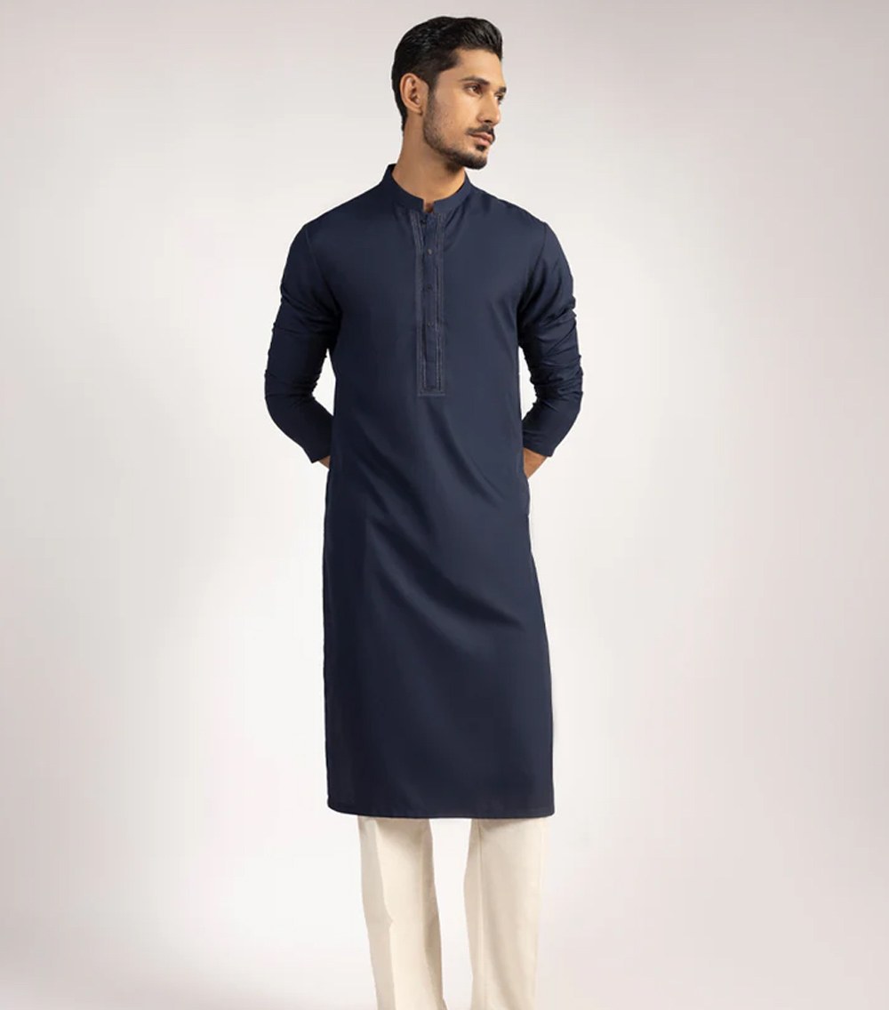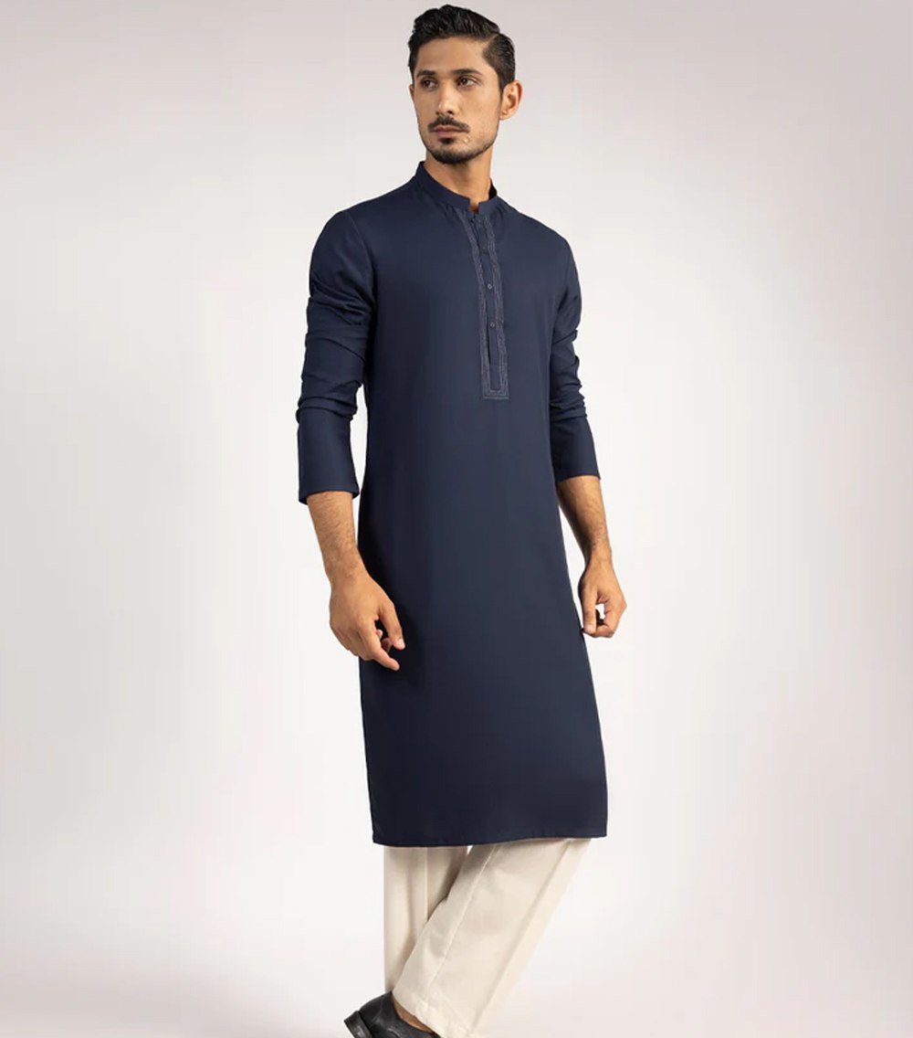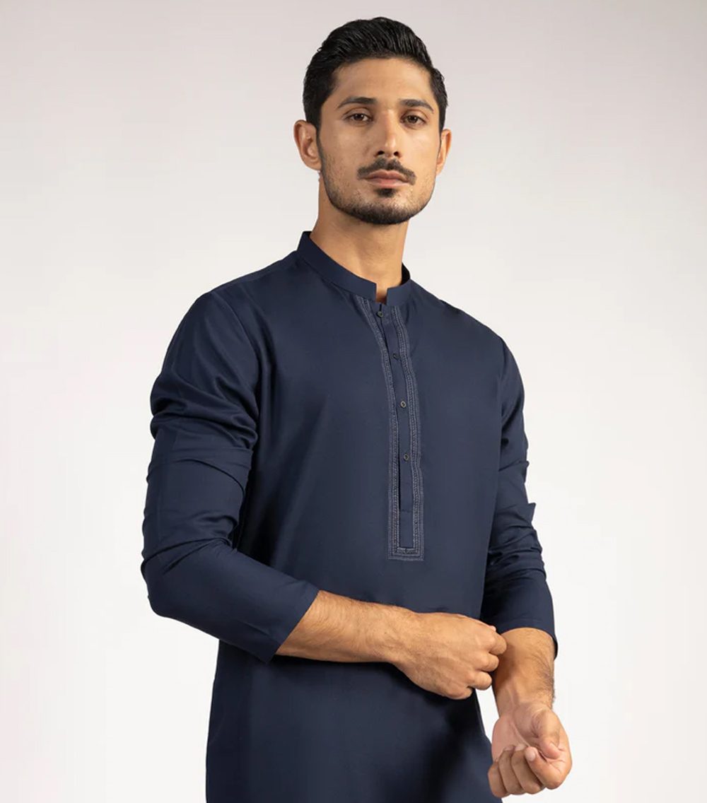 A classic eastern wear set designed with clean stitching and thoughtful detailing. The navy blue semi-formal kurta offers a neat look & comfortable fit – ideal for long wear, daily use, or special occasions with a touch of tradition.