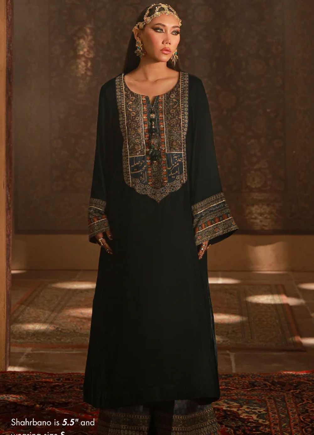 Nayyara Set, is a premium 2-Piece Set with a long-length velvet shirt paired with raw silk Ijaar. This Co-Ord Set features the words of Behzad Lucknavi.