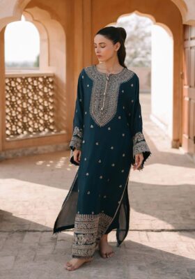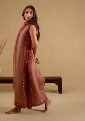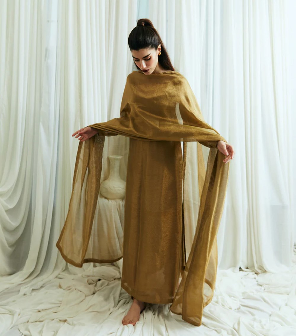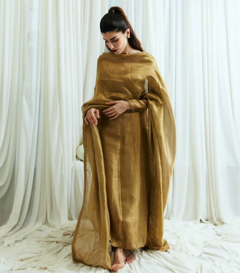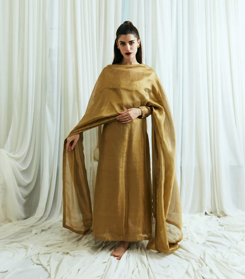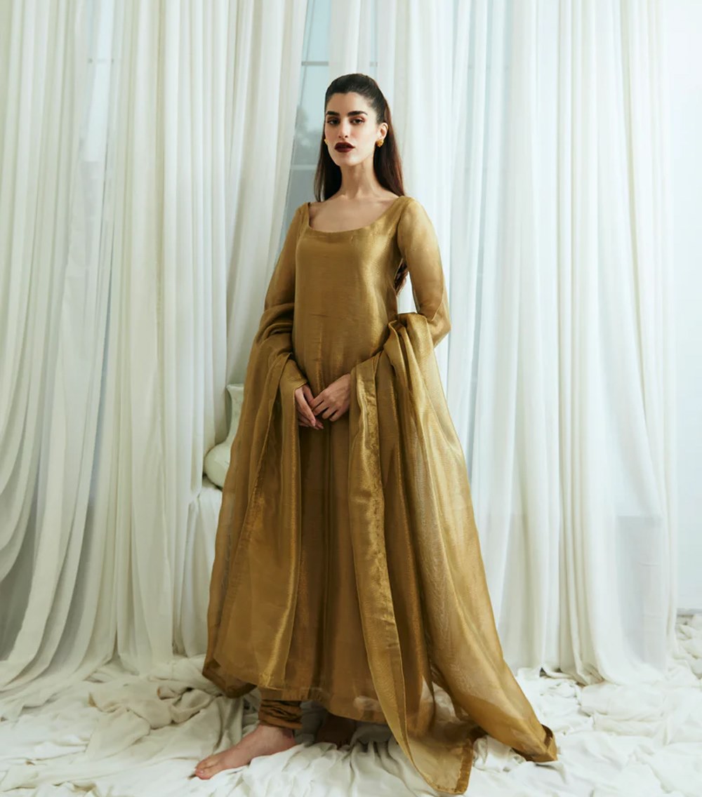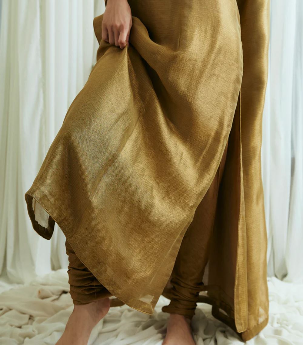 Nina comes as three piece outfit, shirt and duppatta is crafted on zari-net, with korean raw silk chooridar. A minimal timeless outfit wearable for years to come.