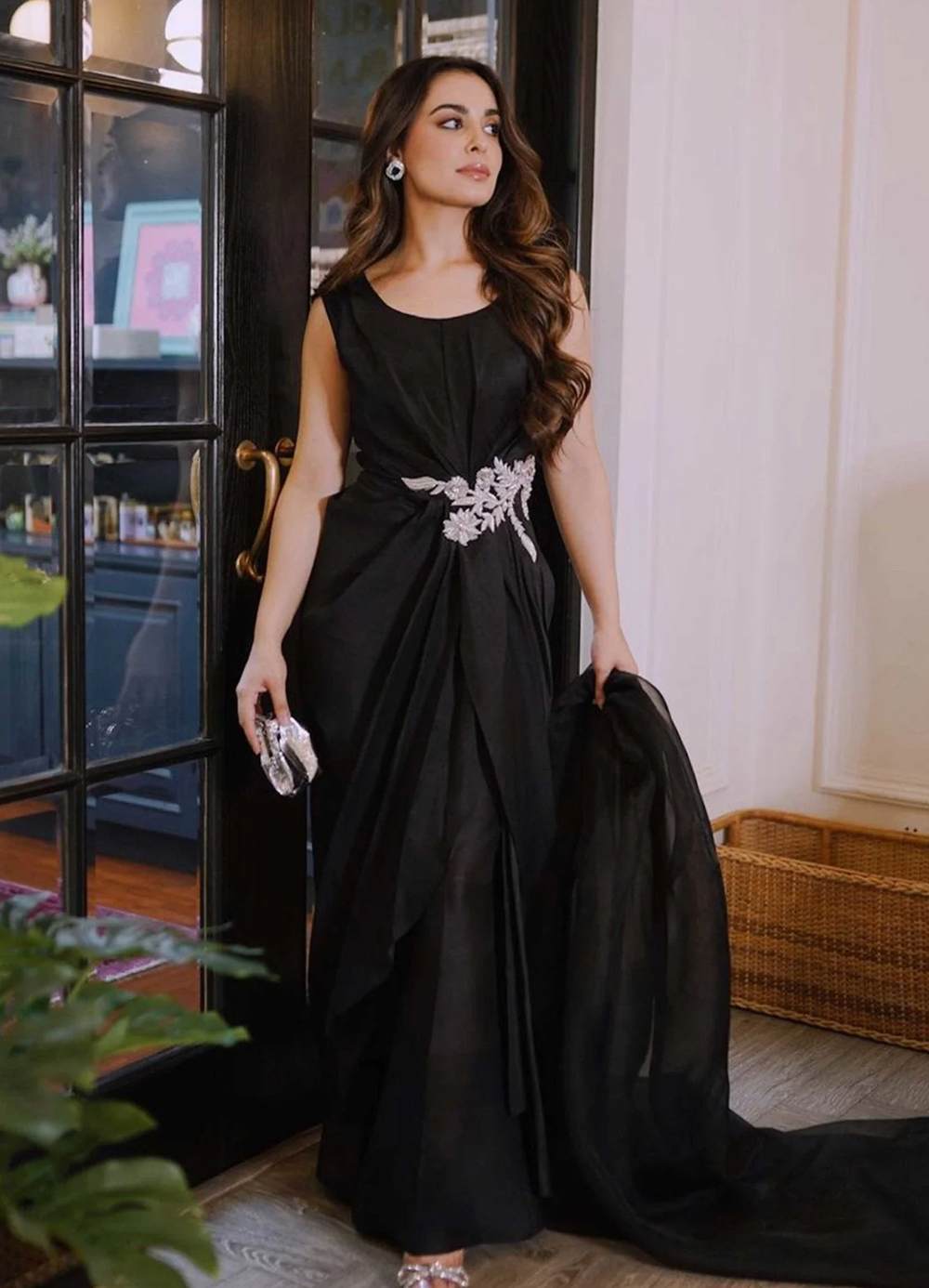 Asymmetrical draped dress with chunky crystal and zardozi embroidery motifs. It is paired with a plain organza dupatta with a silk finish and silk boot-cut pants.