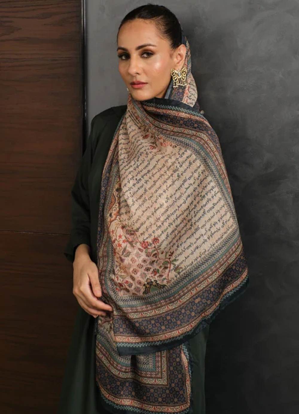 Printed lightweight crinkle silk scarf, featuring Urdu calligraphy of poetry by Nida Fazli.