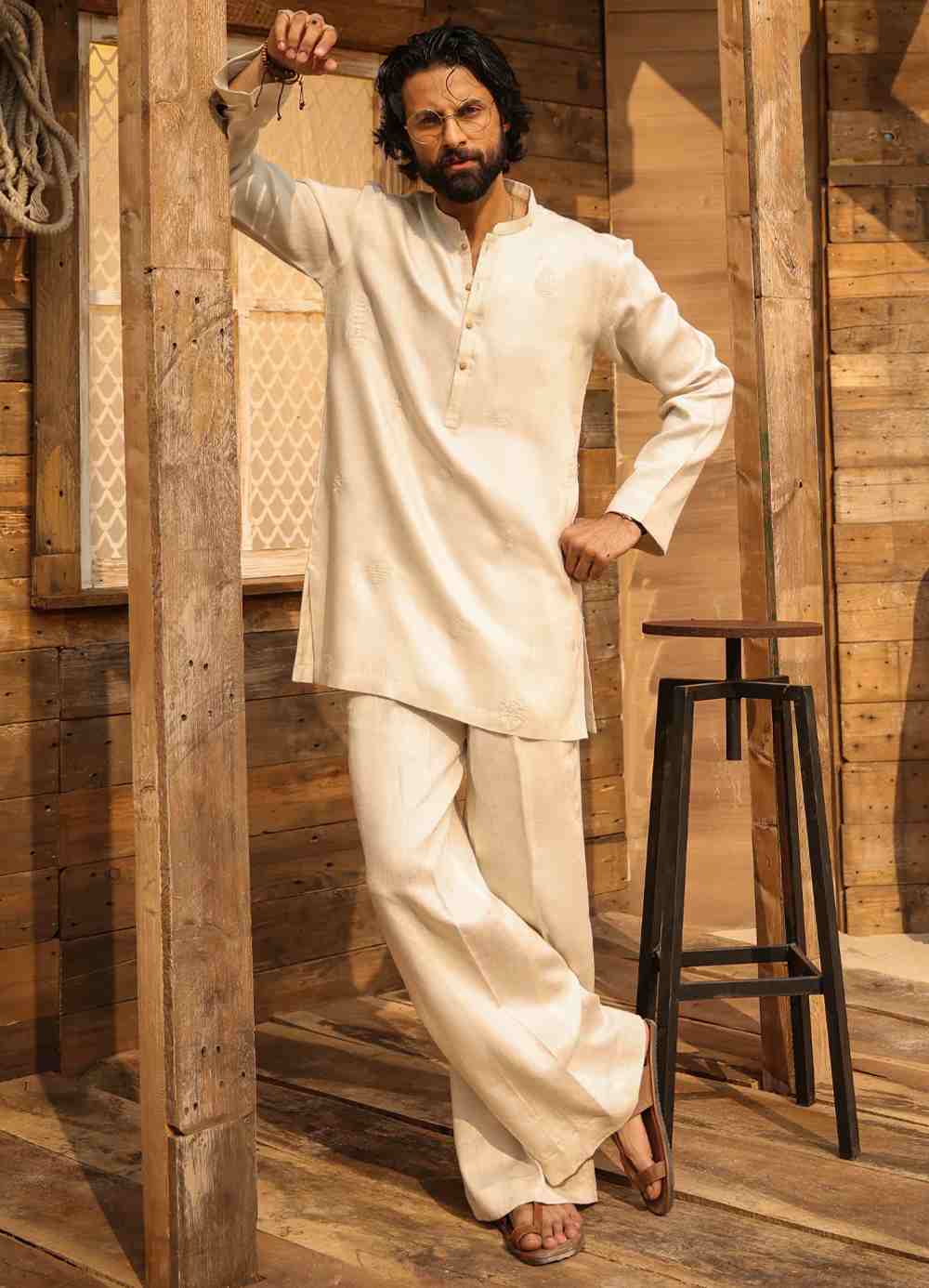 Off White Embroidred Front Kurta Trouser With Stitch Details On The Collar And Placket Fit Style: Modern