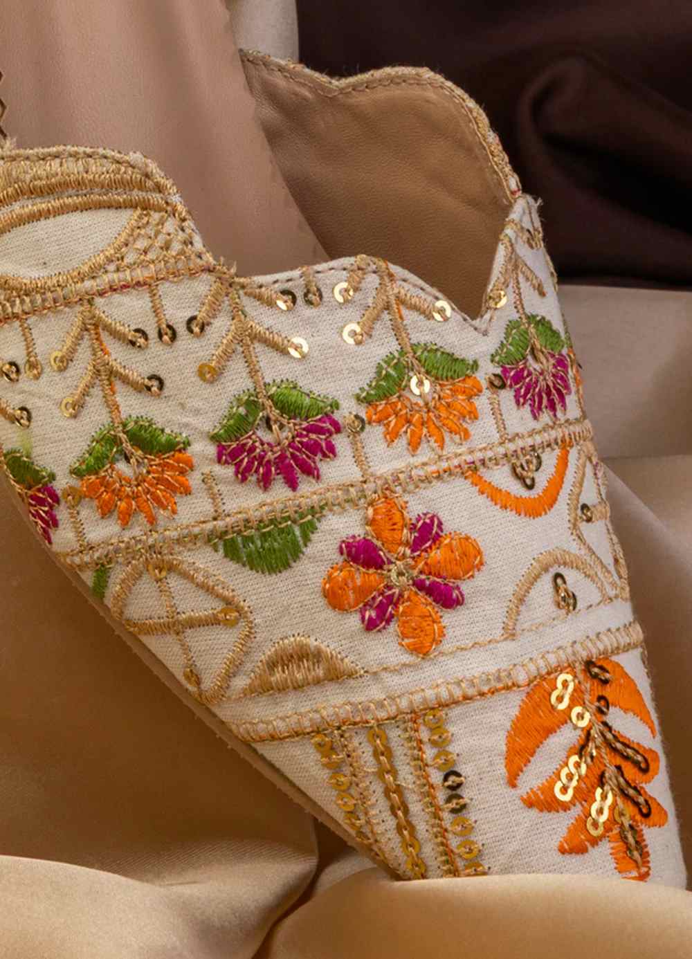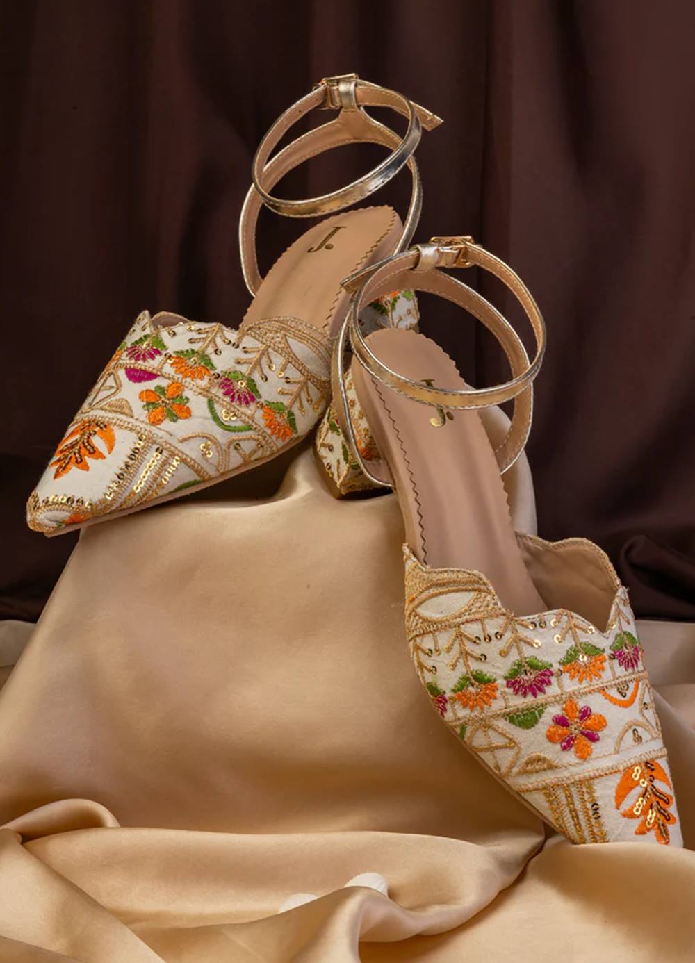 Off-White Lawn Chappal: Floral Embroidered Pointed Heels Step out in elegance with these sophisticated off-white chappals. Adorned with vibrant orange, pink, and green floral embroidery and delicate gold sequin accents, these ankle-strap block heels are the ultimate accessory for the modern woman who loves traditional craftsmanship.