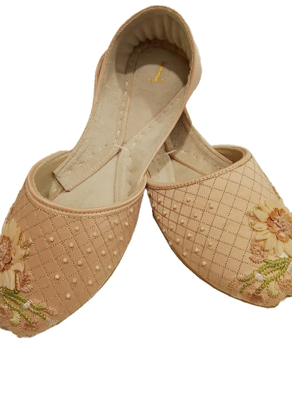 Pink Suede Khussa : Step into a blend of tradition and modern elegance with these handcrafted Khussa shoes. Featuring a soft peach/nude base, these flats are intricately detailed with a quilted lattice pattern and accented with delicate floral embroidery.