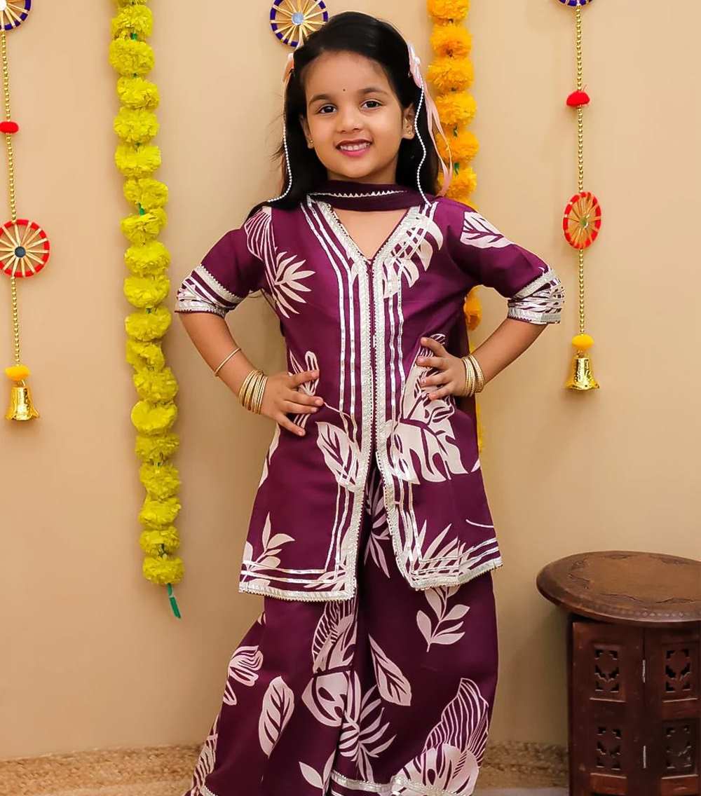 This playful girls’ Plum Kurta Sharara Suit features a heavy, rich cotton kurta paired with comfortable sharara pants, perfect for twirling and festive fun.
